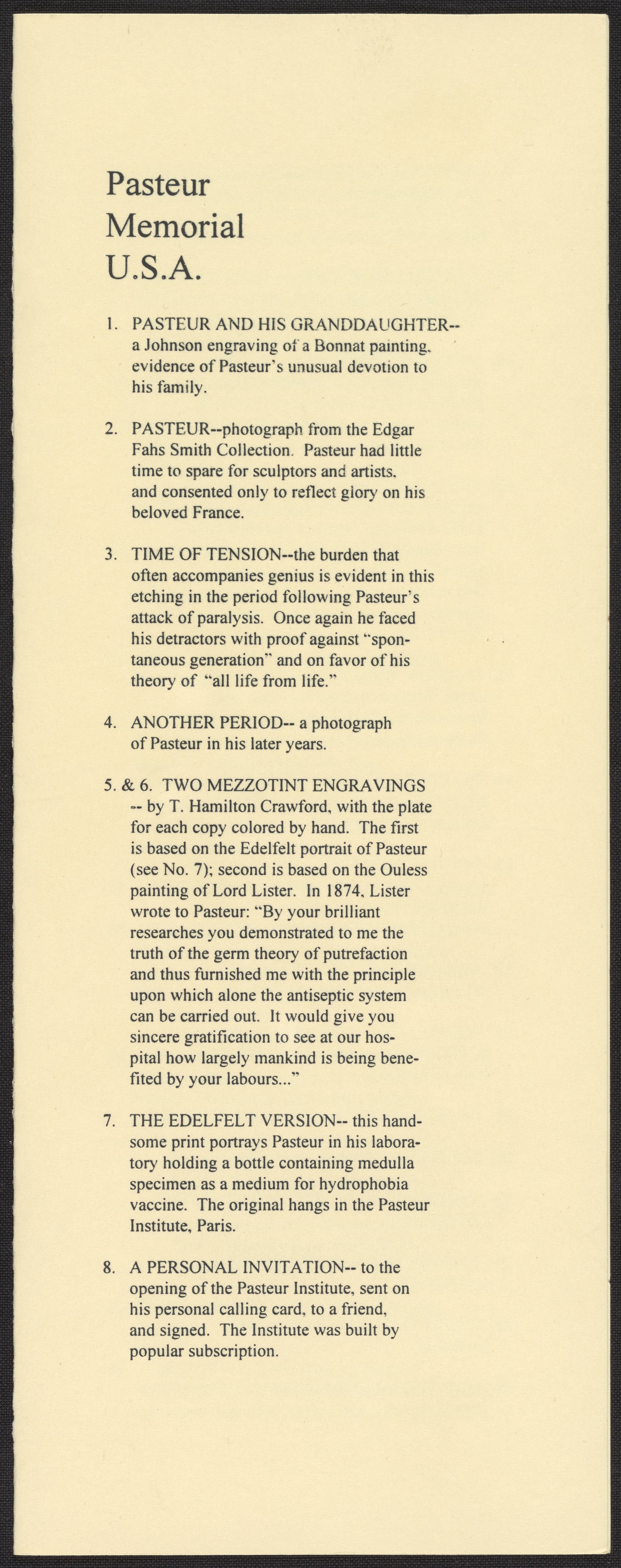 Small JPG1200 x 3031px — 549 KBFull-sized JPG2726 x 6886px — 2.6 MBOriginal fileTIFF — 2726 x 6886px — 53.7 MBCatalog for an exhibition of materials related to Louis Pasteur (1822-1895) believed to have been exhibited at the Fisher Scientific Company. Several entries have been digitized and can be found within the Fisher Pasteur Memorial Collection.