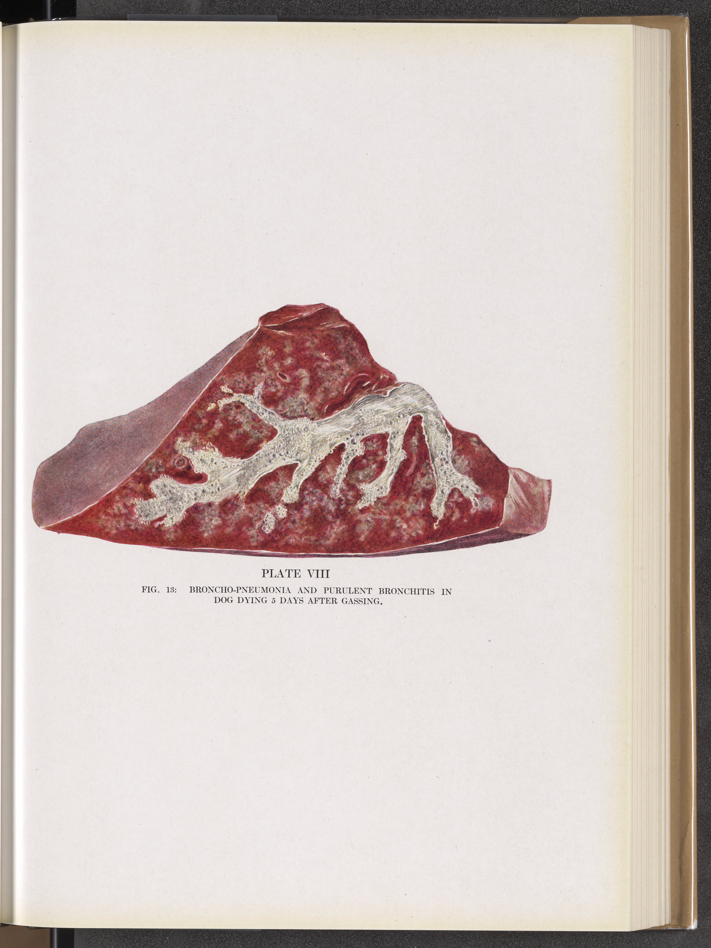 Plate VIII (Fig. 13): Broncho-pneumonia and purulent bronchitis in dog dying 5 days after gassing.