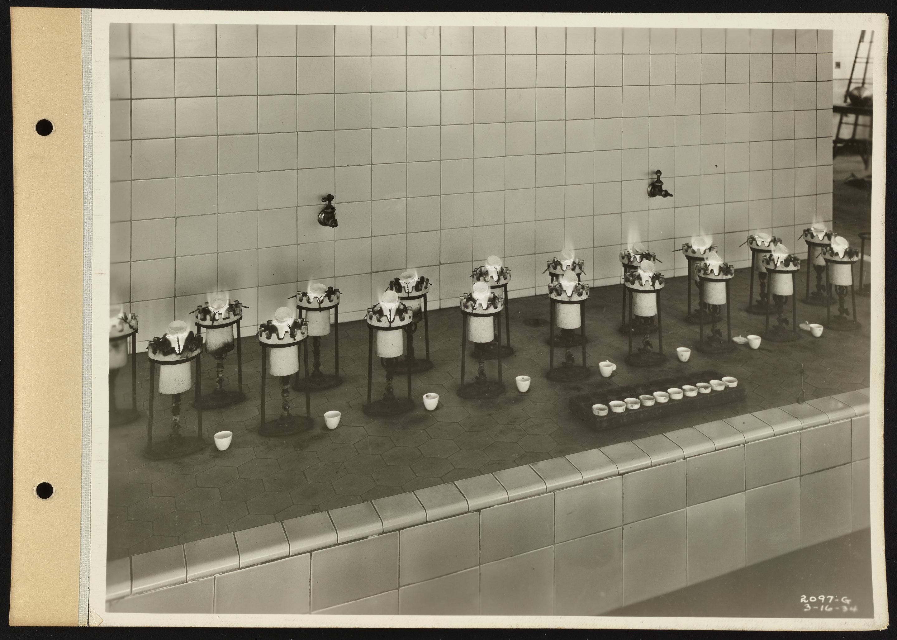 General view of two rows of Bunsen burners in use at the Dearborn Chemical Company's 35th Street Laboratory facility and manufacturing plant. Per notations accompanying the photograph, the burners are being used to burn barium sulphate precipitates, part of the regular scheme of water analysis conducted at the facility. Founded in 1887, the Dearborn Chemical Company was a corporate ancestor of BetzDearborn, Incorporated best known for manufacturing water treatment chemicals for use in boilers, cooling towers, and steam locomotives.