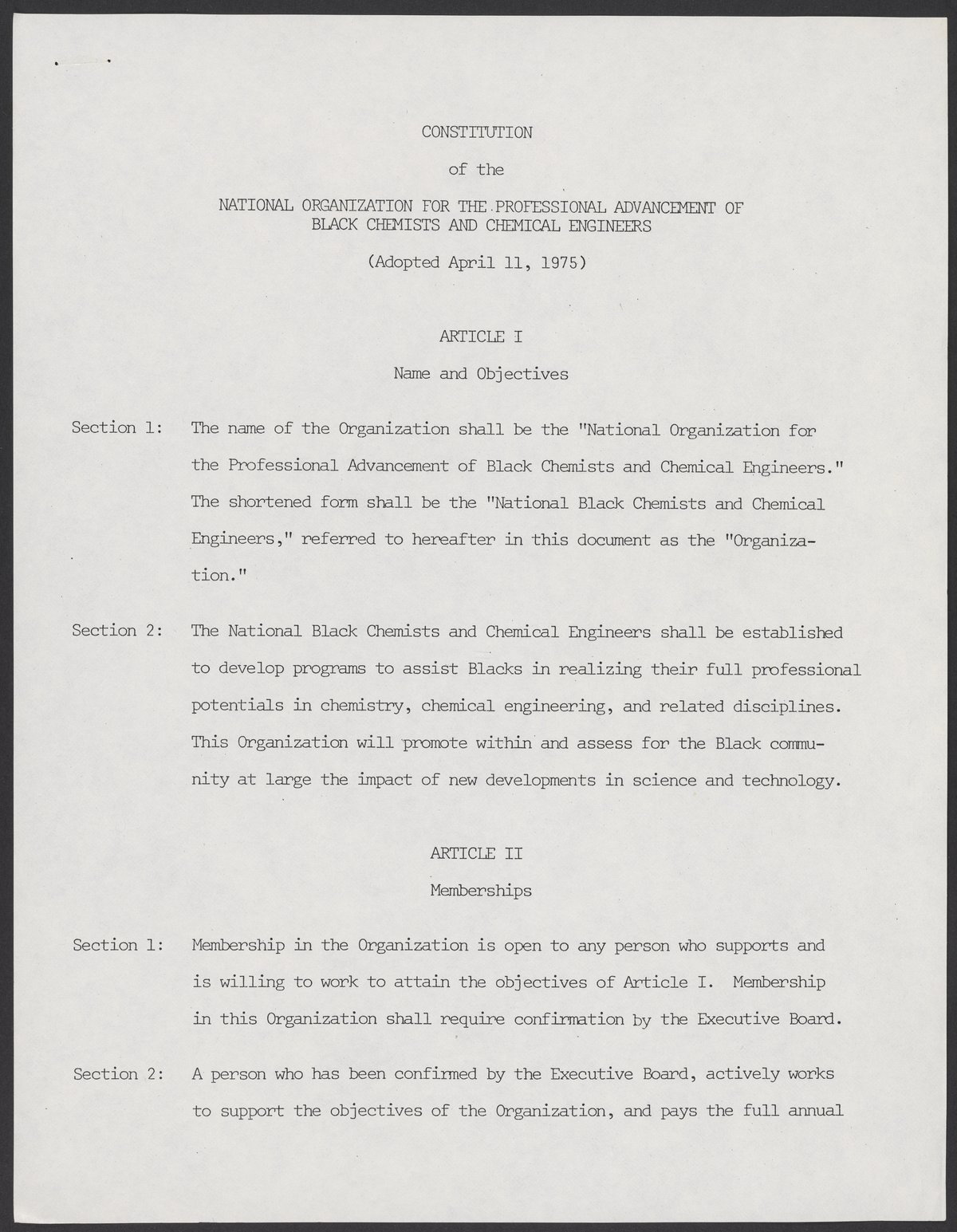 National Organization for Black Chemists and Chemical Engineers. “Preliminary Constitution of the National Organization for the Professional Advancement of Black Chemists and Chemical Engineers,” 1975. William A. Lester, Jr. Papers, Box 44, Folder 19. Science History Institute. Philadelphia. https://digital.sciencehistory.org/works/fi2bjrl.