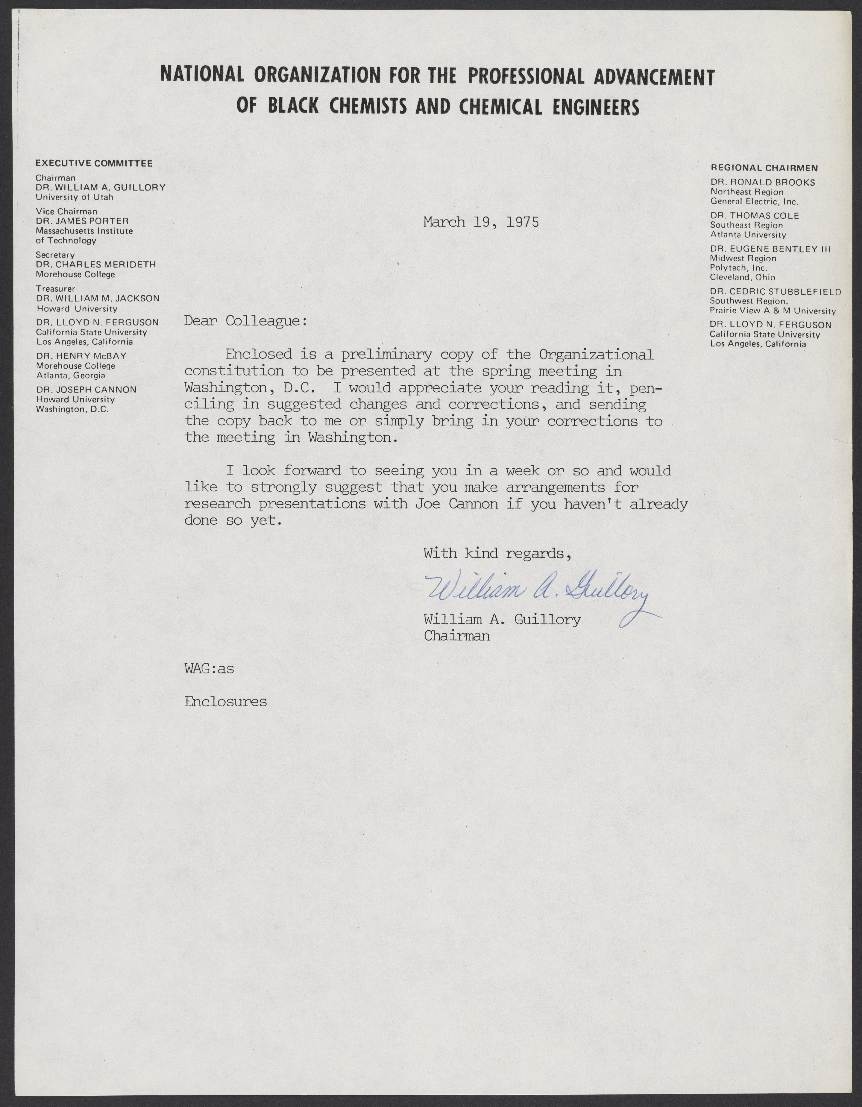 Small JPG1200 x 1540px — 224 KBLarge JPG2880 x 3697px — 1.4 MBFull-sized JPG5358 x 6878px — 5.4 MBOriginal fileTIFF — 5358 x 6878px — 105 MBLetter from William A. Guillory with the preliminary constitution of the National Organization for the Professional Advancement of Black Chemists and Chemical Engineers (NOBCChE).