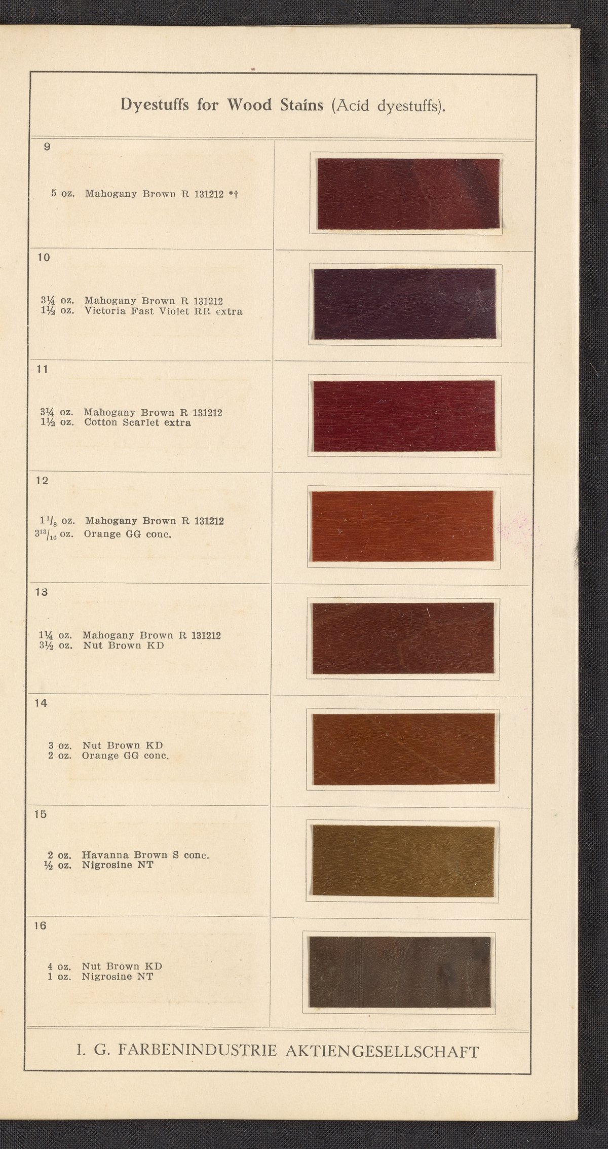 Small JPG1200 x 1992px — 868 KBFull-sized JPG2545 x 4225px — 3.2 MBOriginal fileTIFF — 2545 x 4225px — 30.8 MBSample book for dyeing solutions on wood from the Interessengemeinschaft Farbenindustrie Aktiengesellschaft, a German chemical and pharmaceutical conglomerate. Contains dyeing instructions and sixty-four mounted wood samples on accordion-folded pages. Digital content includes all pages and a representative image of the full foldout.