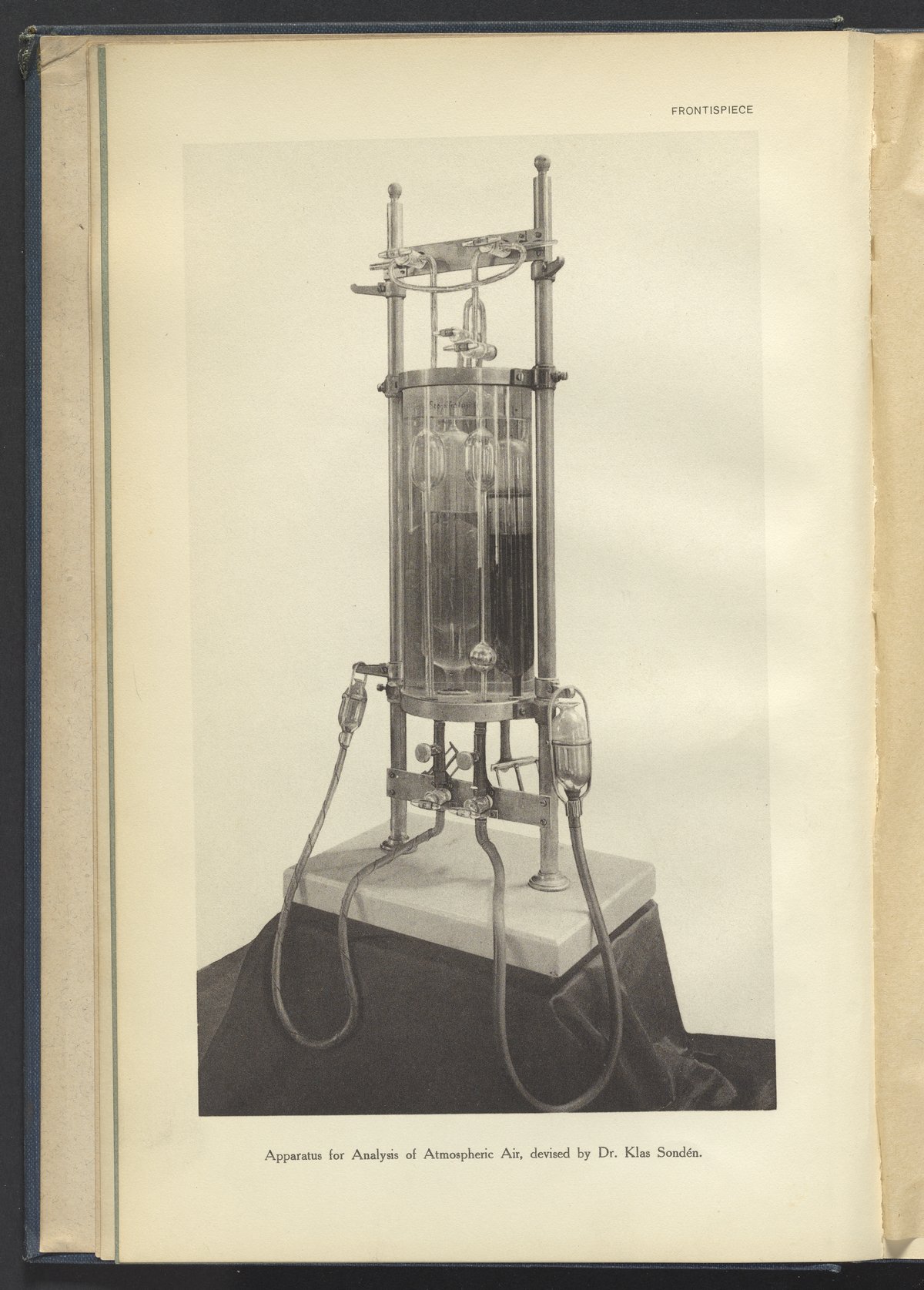Benedict, Francis Gano. “Apparatus for Analysis of Atmospheric Air, Devised by Dr. Klas Sondén.” Washington (D.C.): Carnegie Institution of Washington, 1912. QC851.B46 1912. Science History Institute. Philadelphia. https://digital.sciencehistory.org/works/fj2362734.