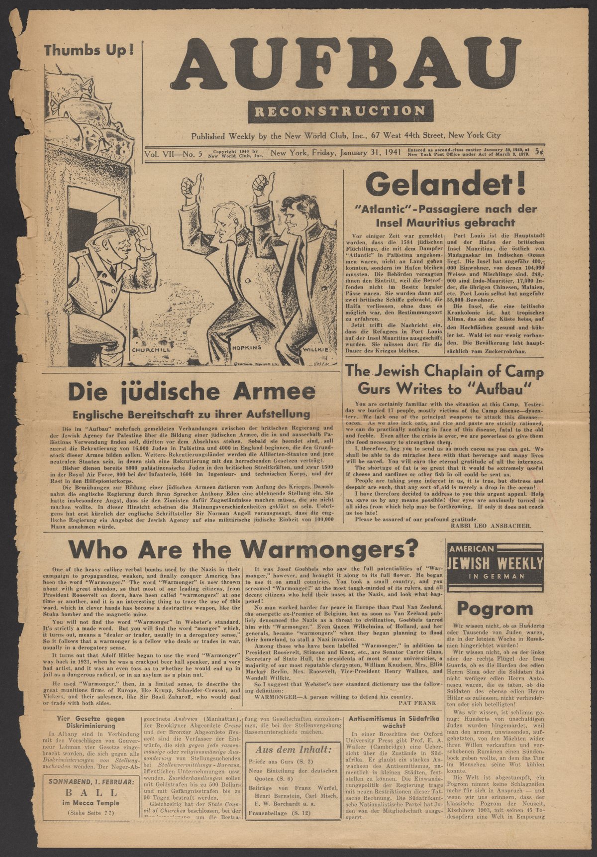 “Aufbau, Volume 7, Number 5.” Aufbau (New York, N.Y.), January 31, 1941. Papers of Max Bredig, Box 8, Folder 8. Science History Institute. Philadelphia. https://digital.sciencehistory.org/works/fj5h1tg.