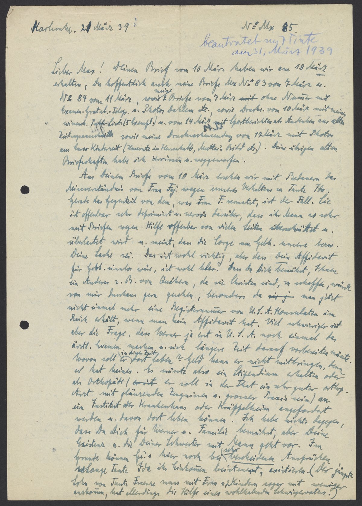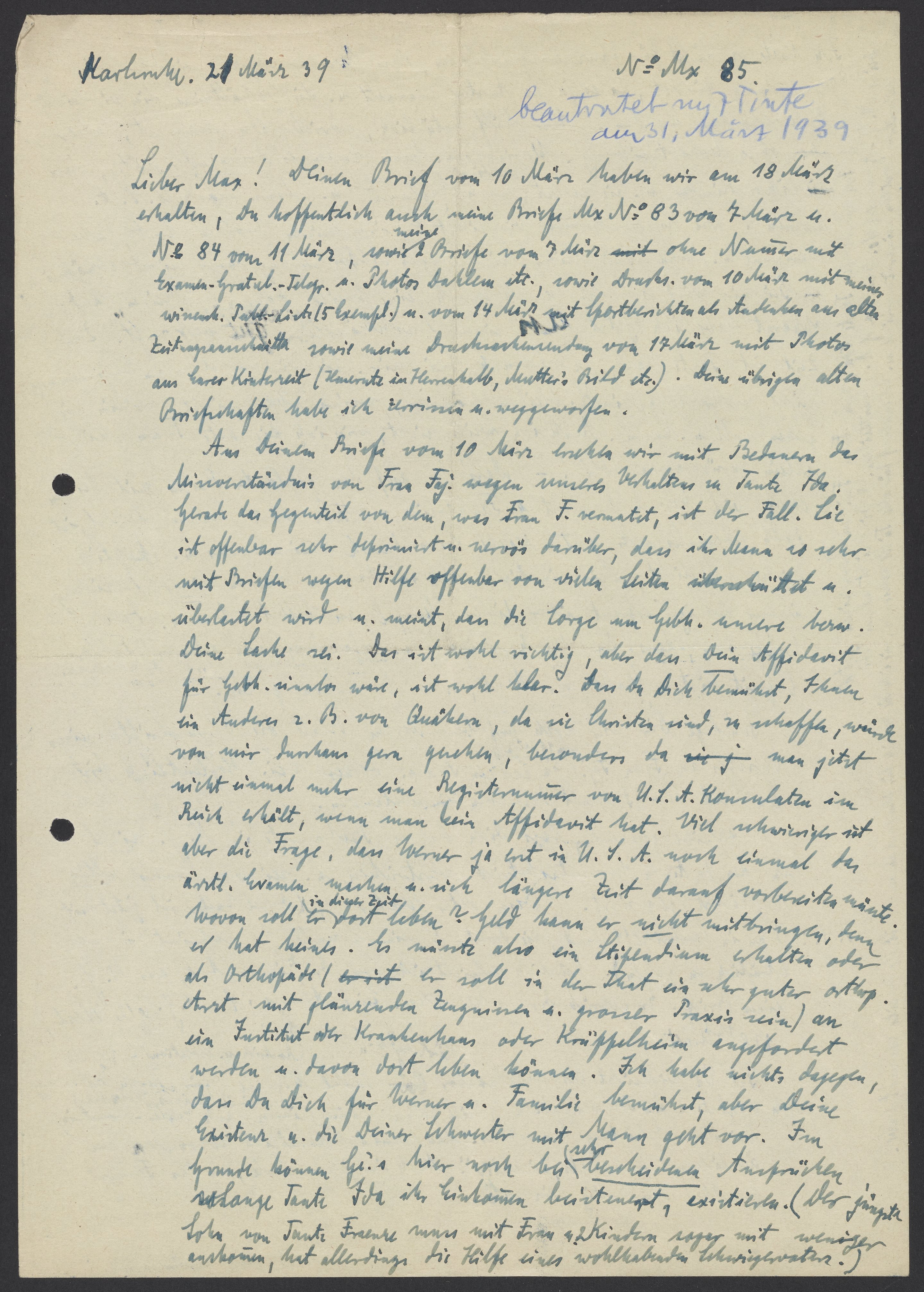 Lieber Max! Deinen Brief vom 10 März haben wir am 18 März erhalten, Du hoffentlich meine Briefe Mx No 83 vom 7 März u. No 84 vom 11 März, sowie meine 2 Briefe vom 7 März ohne Nummer mit Examen-Gratlu.-Telegr. u. Photos Dahlem etc., sowie Drucks. Vom 10 März mit meiner wissen. Publ.-Liste (5 Exempl.) u. vom 14 März mit Sportberichten als Andenken aus alten Zeitungsausschnitten sowie meine Drucksachensendung vom 17 März mit Photos aus Eurer Kinderzeit (Aalrute in Herrbenhalb, Mutter’s Bild etc). Deine übrigen alten Briefschaften habe ich zerrissen u. weggeworfen.
