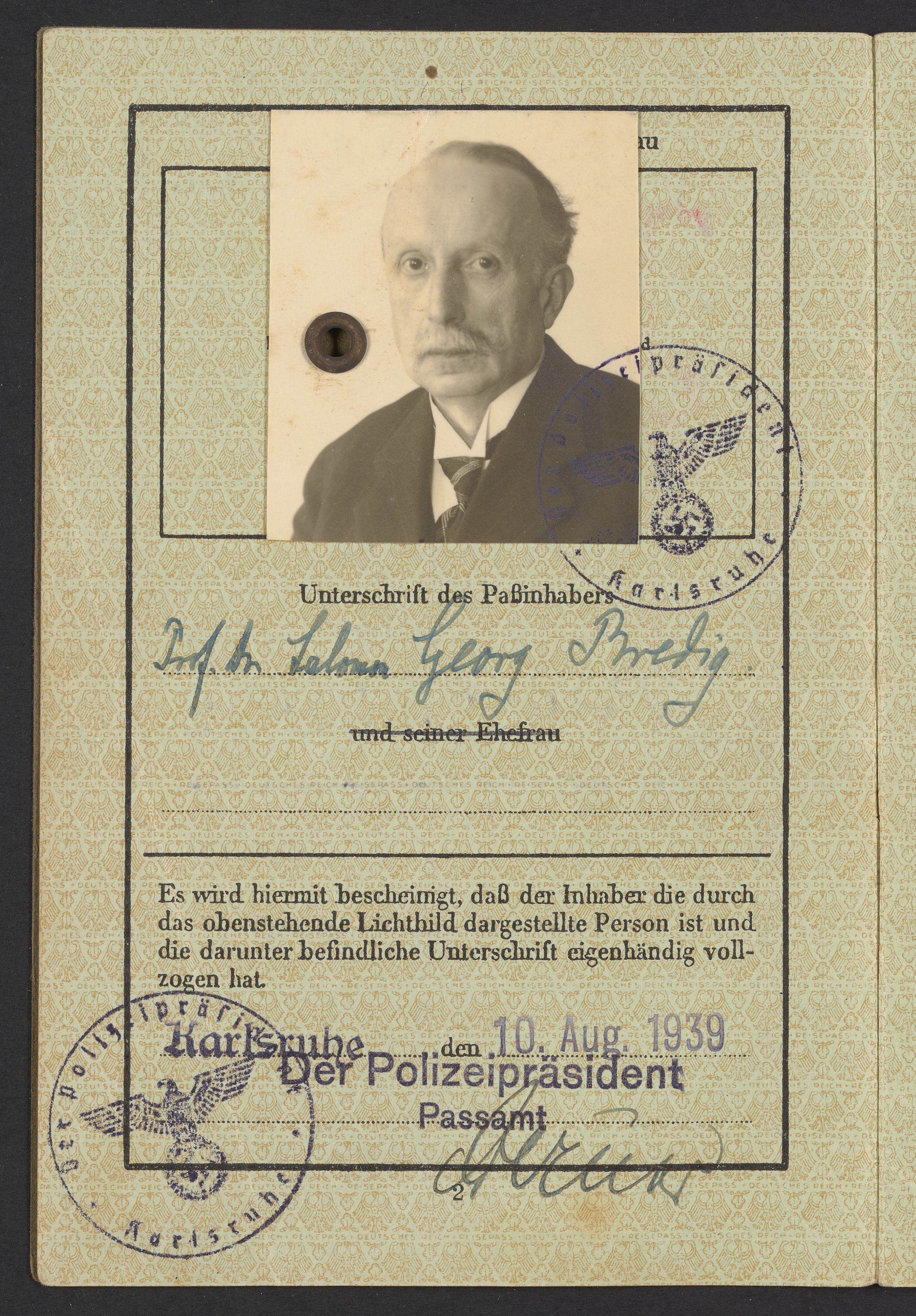 Karlsruhe (Germany). Polizeipräsident Passamt. “George Bredig's German Reich Passport,” August 7, 1939. Papers of Georg and Max Bredig, Box 4, Folder 20. Science History Institute. Philadelphia. https://digital.sciencehistory.org/works/fk7gfc7.