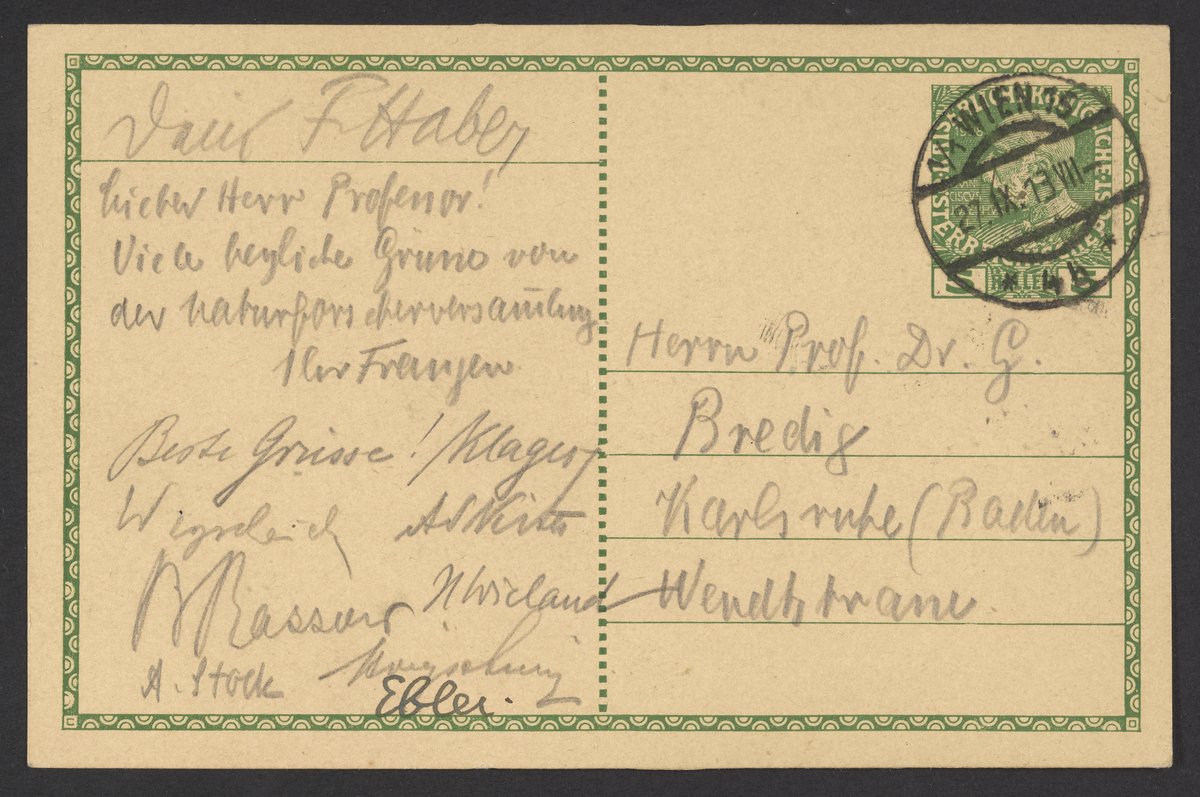 Postcard from attendees of a scientific congress in Vienna addressed to Georg Bredig