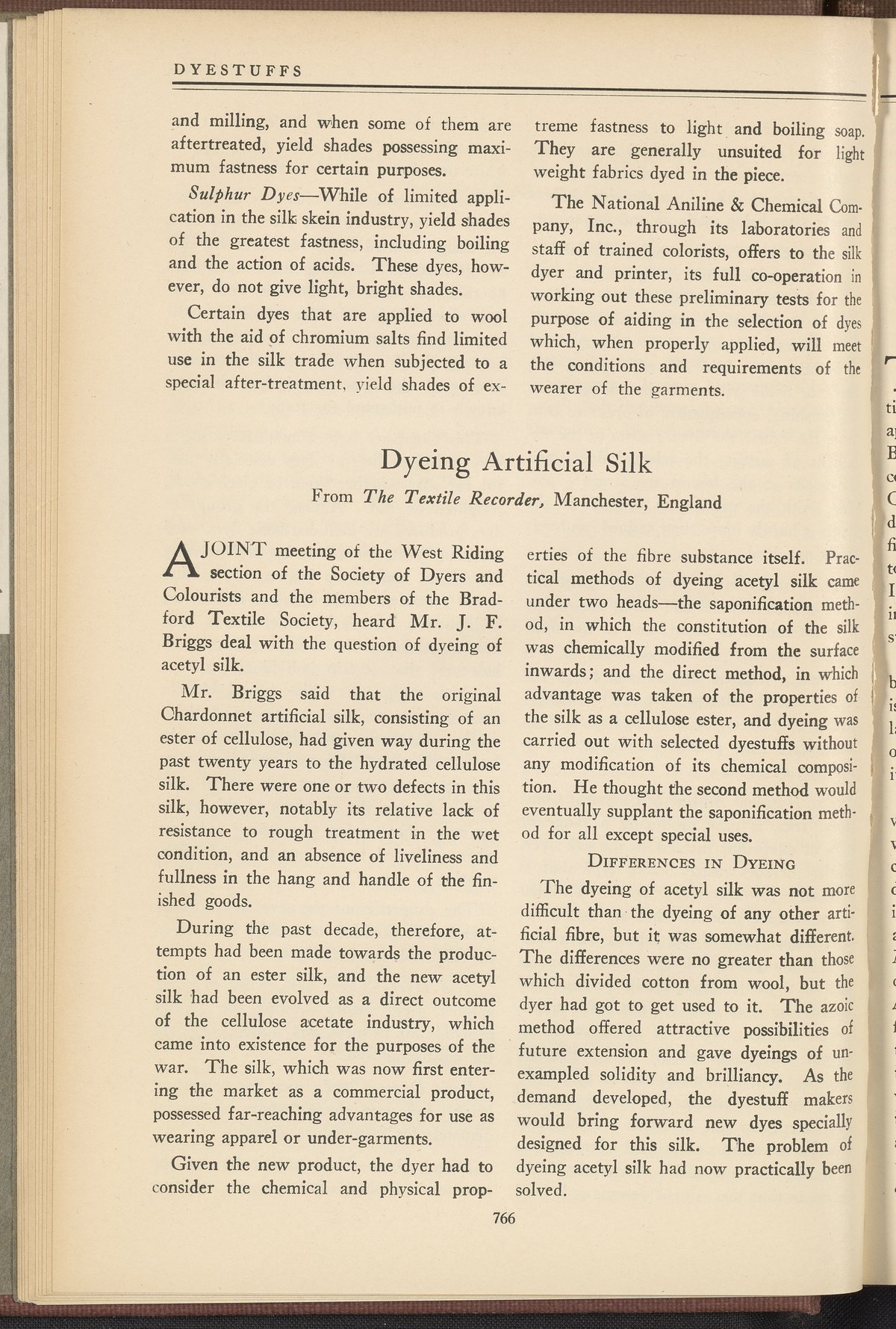 The journal contains reprints of select articles from periodicals in the dyeing and textile fields. This issue focuses on silk dying. Contains articles such as An Old Chinese Story of the Origin of Silk from The American Magazine on the Orient; "National" Dyes for the Silk Trade by Louis J. Matos; Dyeing Artificial Silk from The Textile Recorder; Buffalo Dye Plant Endeavors to Set High Standards of Production by M. D. C. Crawford from The Daily News Record; and Waterproofing Artificial Silk from Textiles. This issue includes black and white printed illustrations. Digitized content does not include the final page of the issue due the fragility of the physical work.
