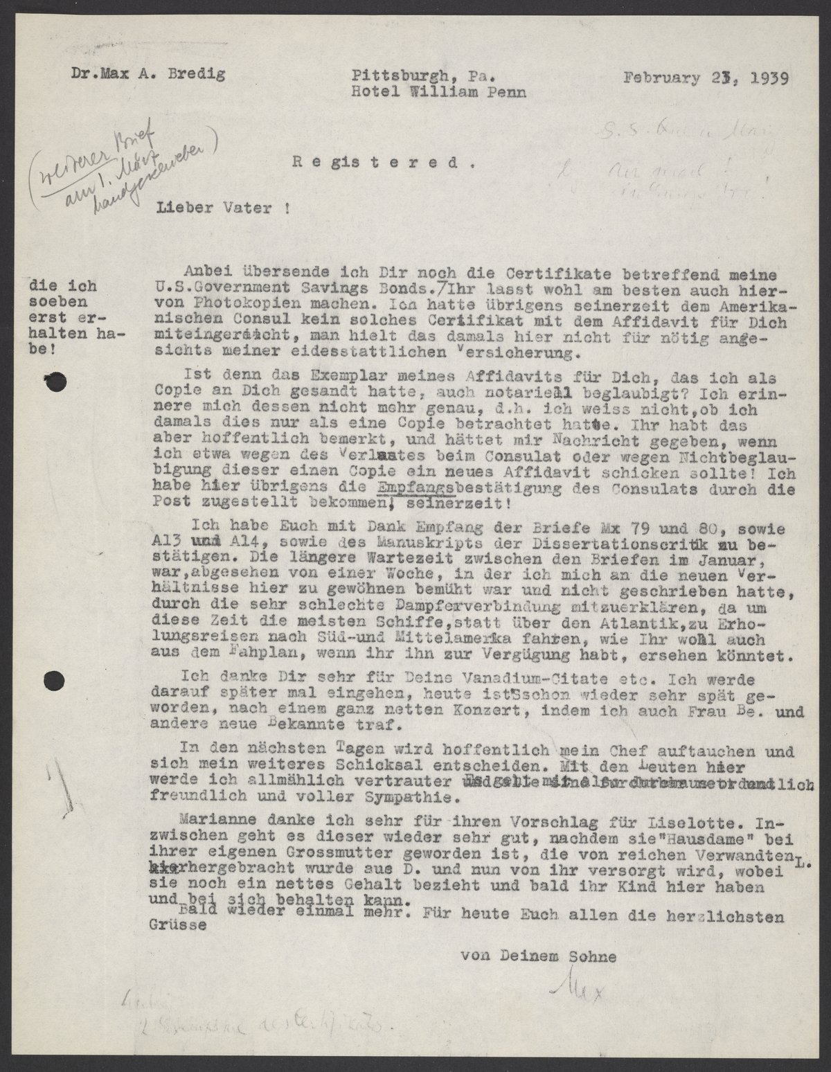 Max Albert Bredig (1902-1977) updates his father, Georg Bredig (1868-1944), on affidavits, savings bonds certificates, and his life in the United States.