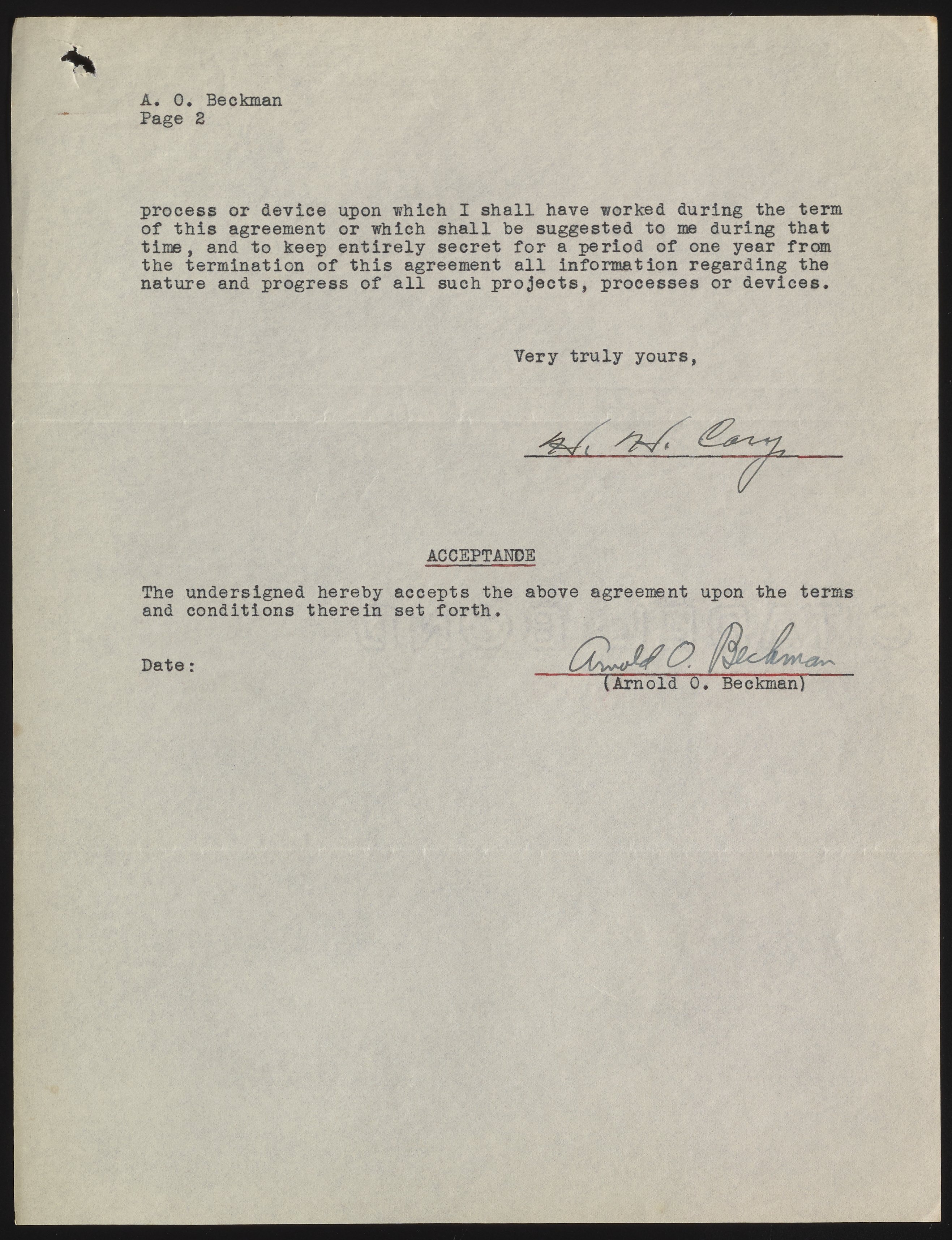 Contract between Howard Cary and Arnold O. Beckman