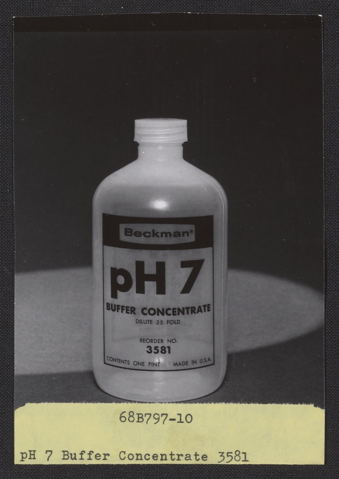 Beckman Instruments Photographic Services Section. “Beckman PH 7 Buffer Concentrate,” 1968. Beckman Historical Collection, Box 86. Science History Institute. Philadelphia. https://digital.sciencehistory.org/works/fn106z35s.
