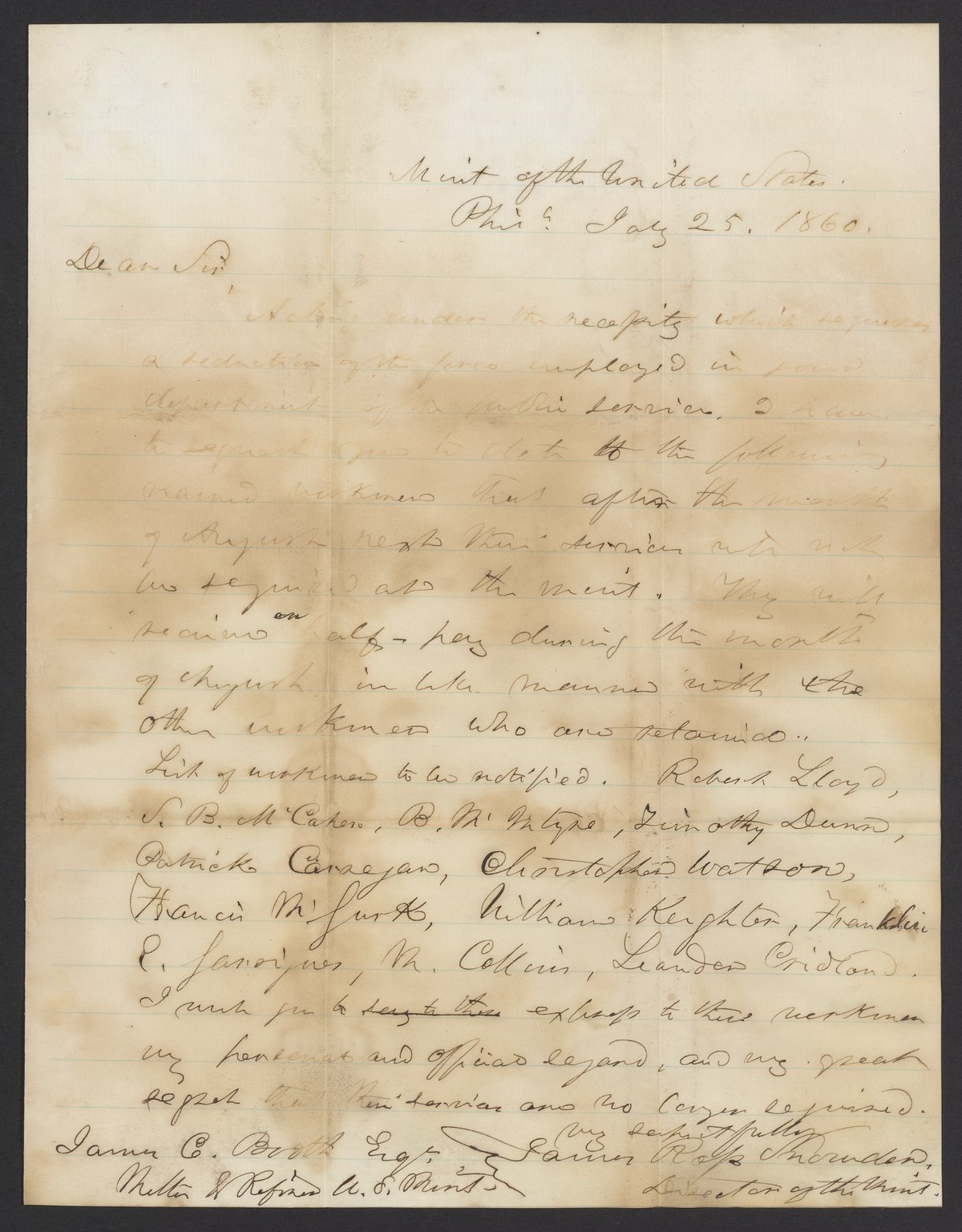 Small JPG1200 x 1537px — 246 KBLarge JPG2880 x 3689px — 1.2 MBFull-sized JPG3246 x 4158px — 1.5 MBOriginal fileTIFF — 3246 x 4158px — 38.7 MBJames Ross Snowden (1809-1878), Director of the United States Mint, writes to James Curtis Booth (1810-1888) naming eleven men to be dismissed from the Mint on the 31st of August.