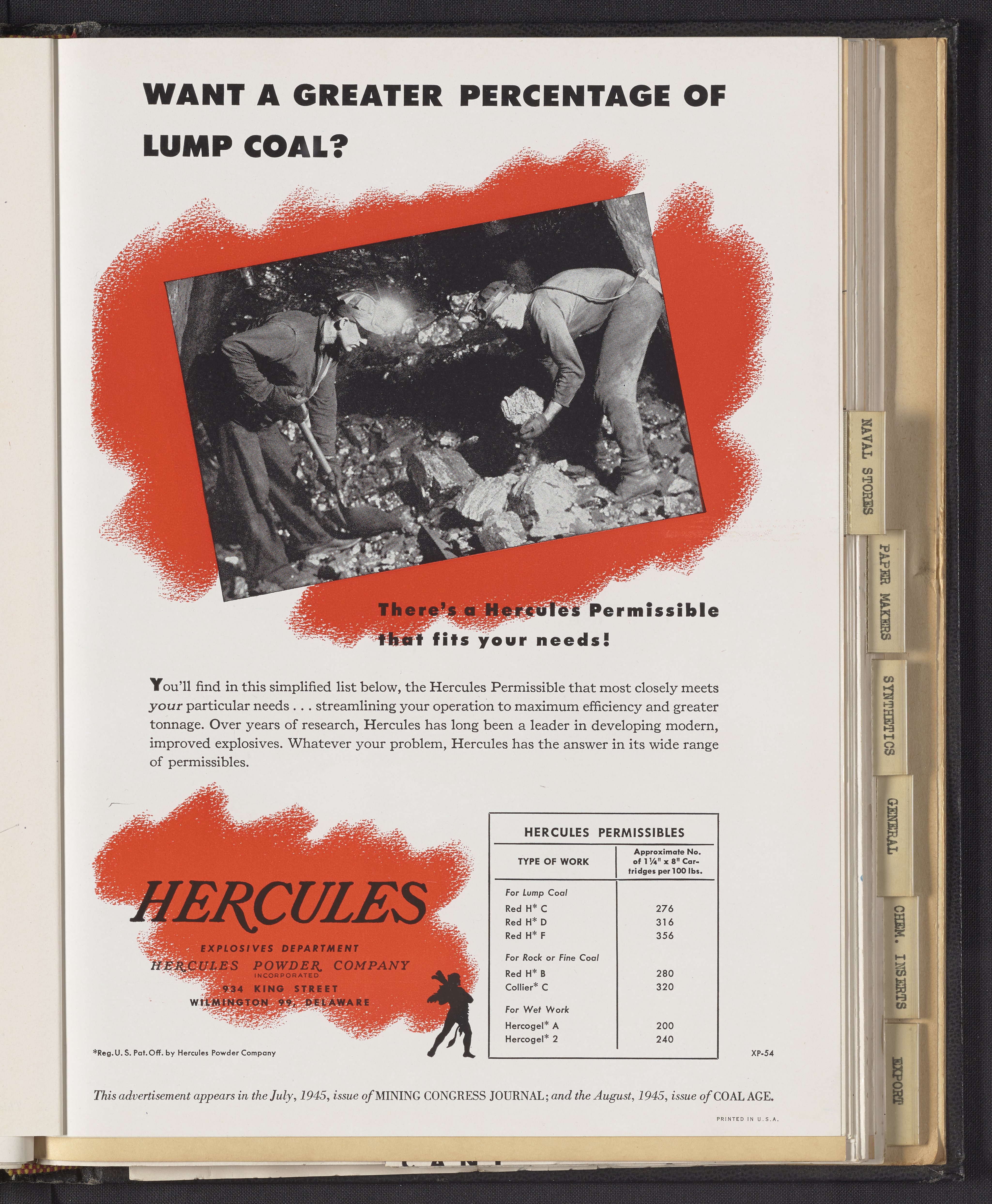 Hercules Incorporated. “Want a Greater Percentage of Lump Coal?” 1945 Hercules Advertisements, 1945. Records of Hercules Incorporated, Volume 1945. Science History Institute. Philadelphia. https://digital.sciencehistory.org/works/fq977v45h.