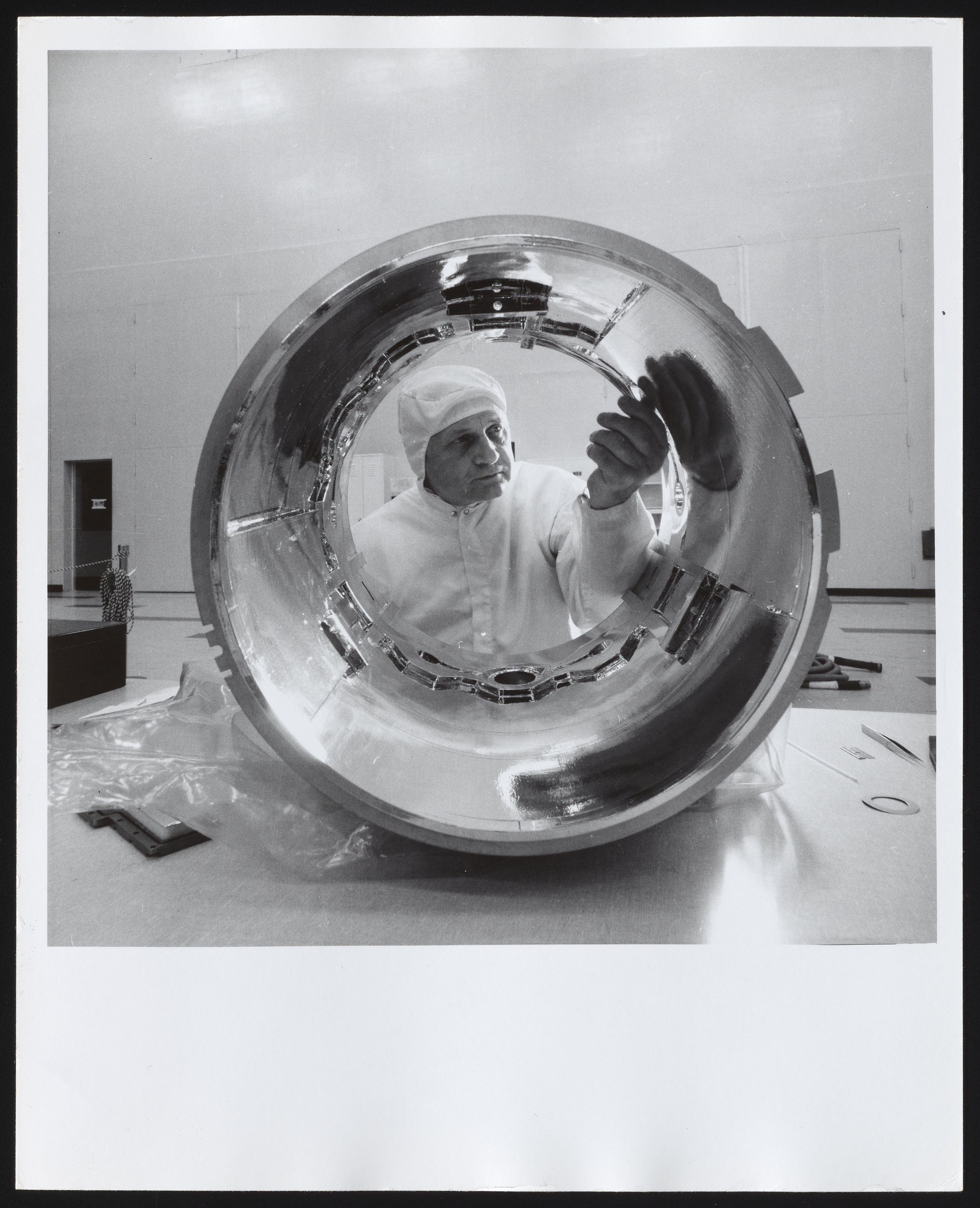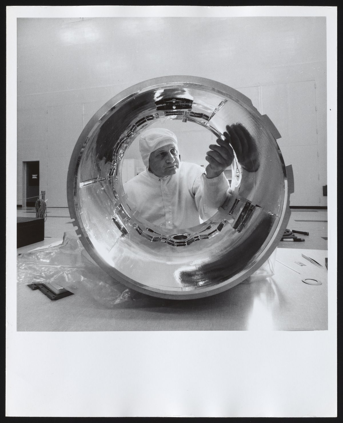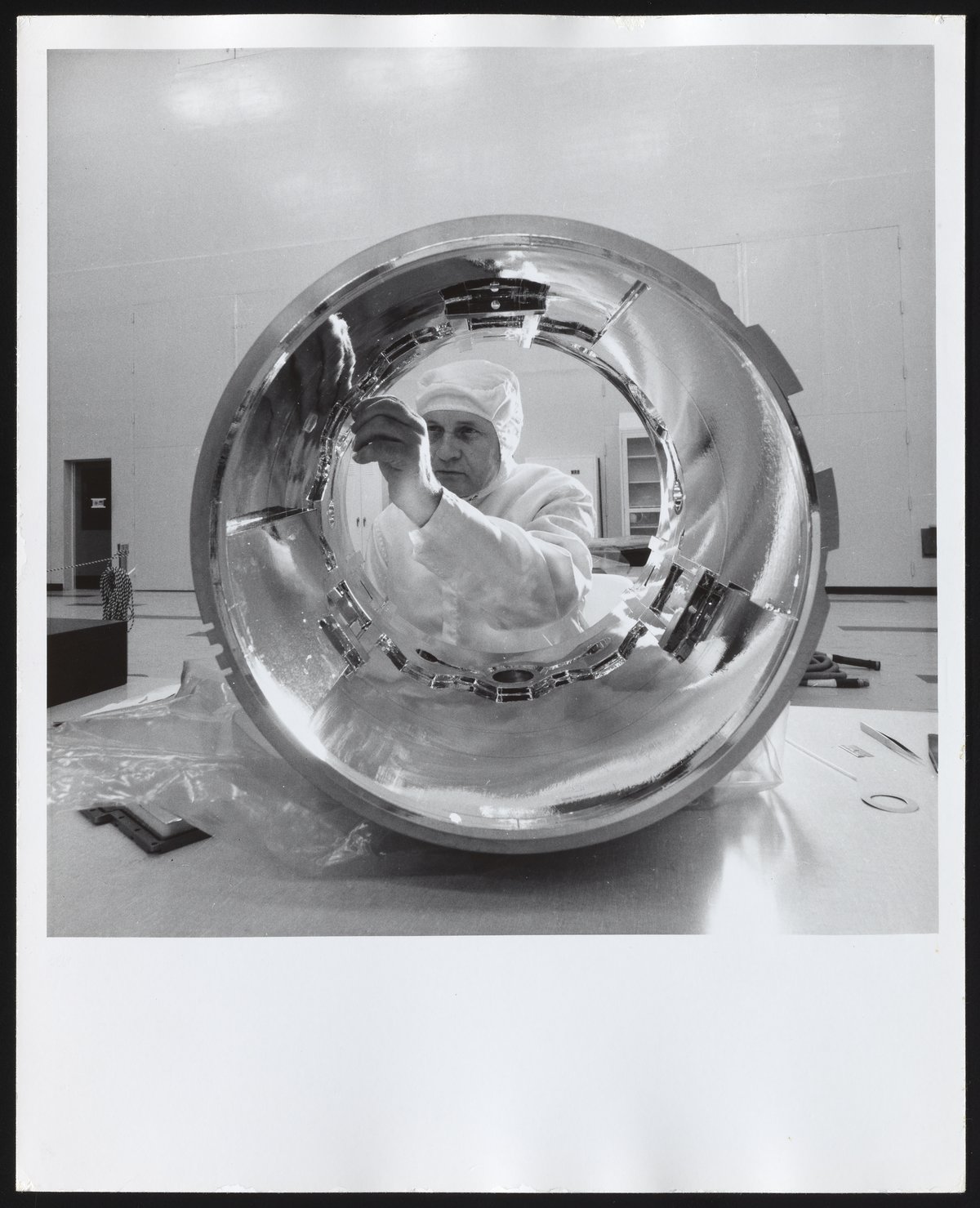 Small JPG1200 x 1479px — 213 KBLarge JPG2880 x 3549px — 1.1 MBFull-sized JPG3444 x 4244px — 1.5 MBOriginal fileTIFF — 3444 x 4244px — 41.9 MBTwo views of an infrared sensor, likely designed for use with a telescope or other optical system, in production at an unidentified Perkin-Elmer Corporation facility. The employee visible in the photographs is also unidentified.