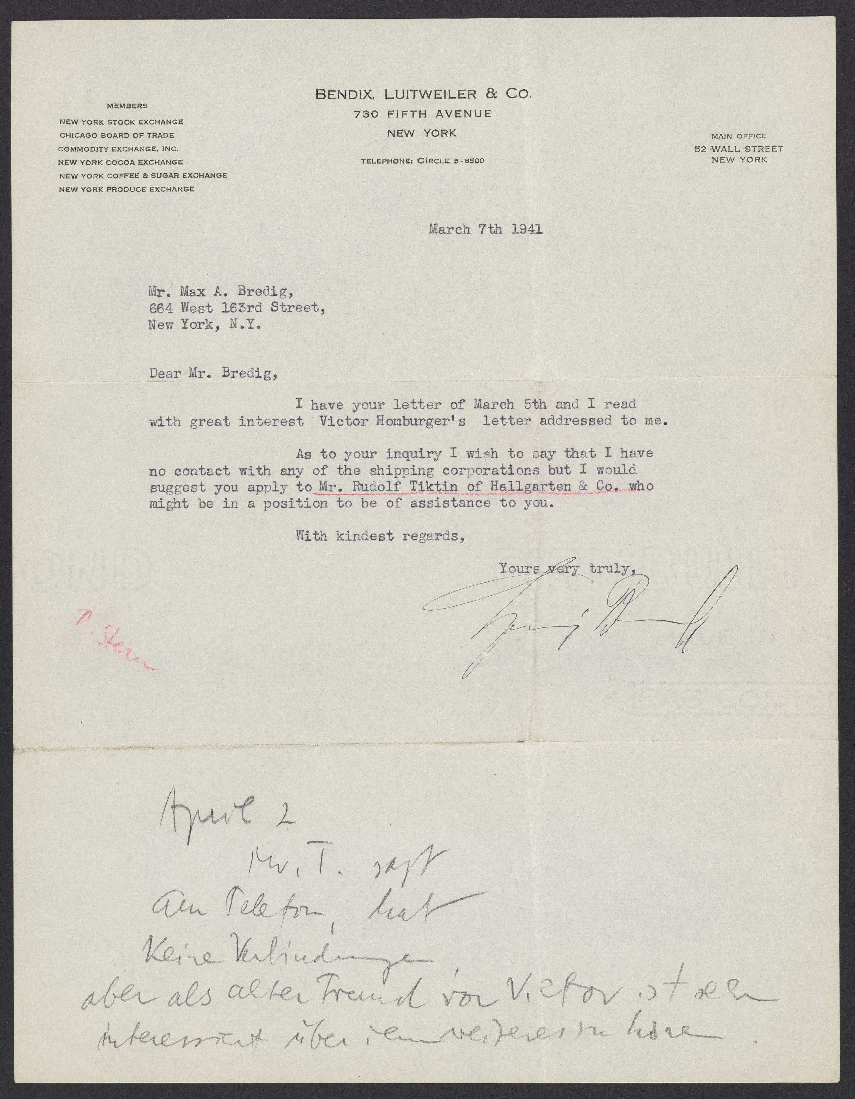 Letter from Ludwig Bendix to Max Bredig, March 7, 1941