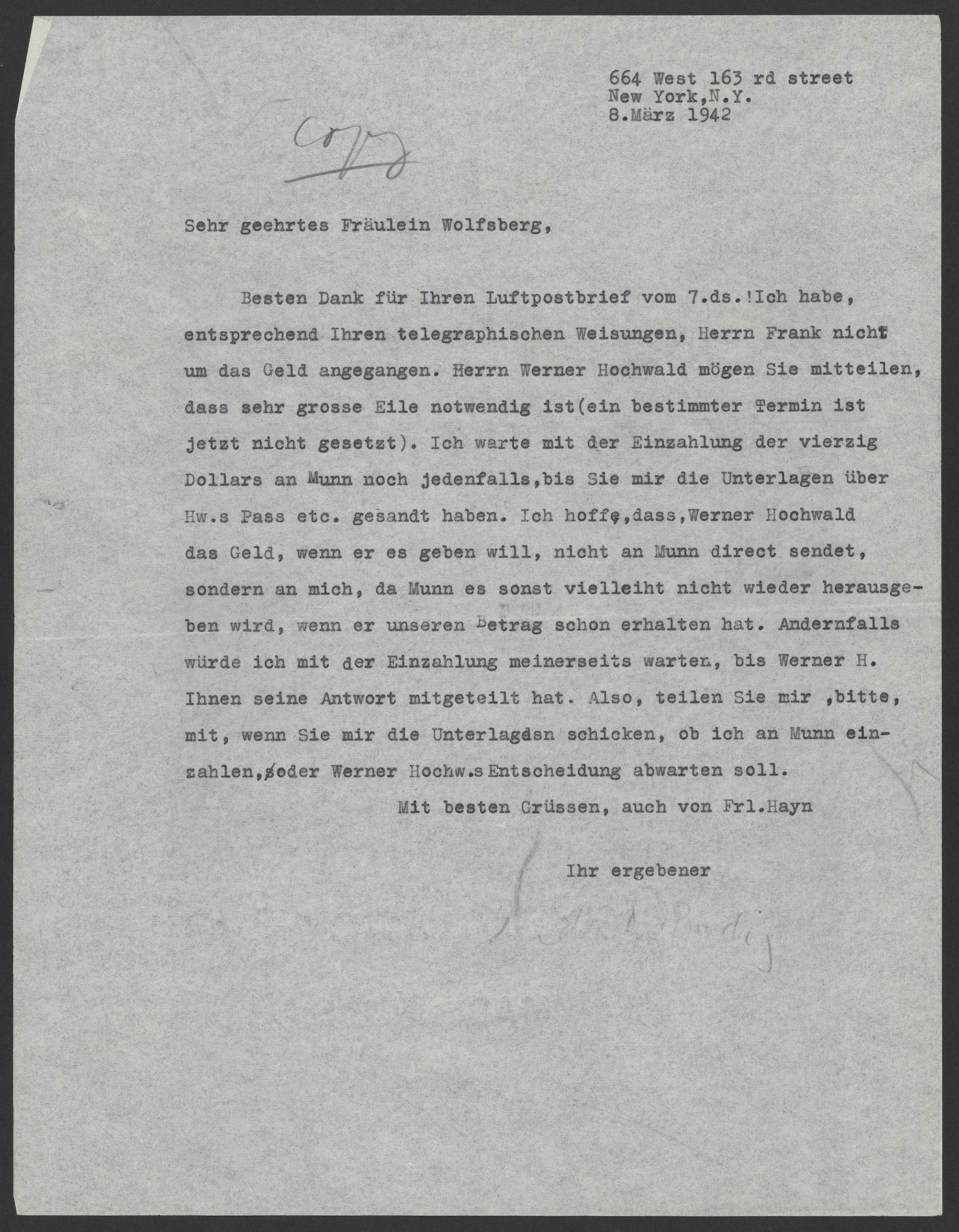 Many thanks for your letter sent by airmail on March 7th. Per your instructions in the telegram, I didn’t ask Mr. Frank for money. You may want to inform Mr. Werner Hochwald that you are very much in a hurry (a certain date has not yet been determined). In any case, I will wait to pay Mr. Munn the $40 until you have sent me the documents pertaining to Hochwald’s passport. If Werner Hochwald wants to donate money, I hope he does not send it directly to Mr. Munn, but rather to me because Mr. Munn may not return it if he has already received our sum. Otherwise, I will wait to pay until Werner H. has given you an answer. Please let me know when you send me the documents and if I should pay Mr. Munn or wait for Werner Hochwald’s decision.