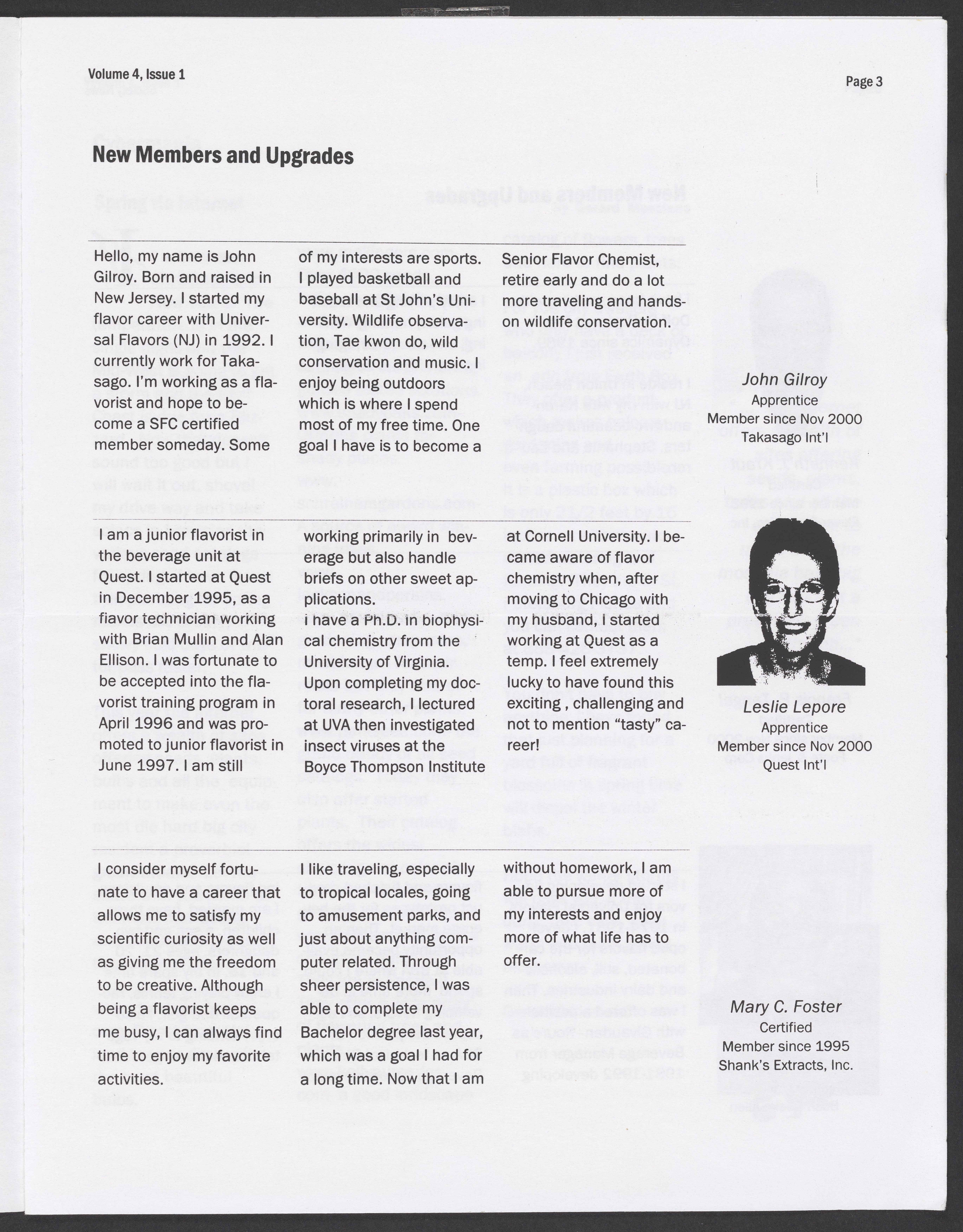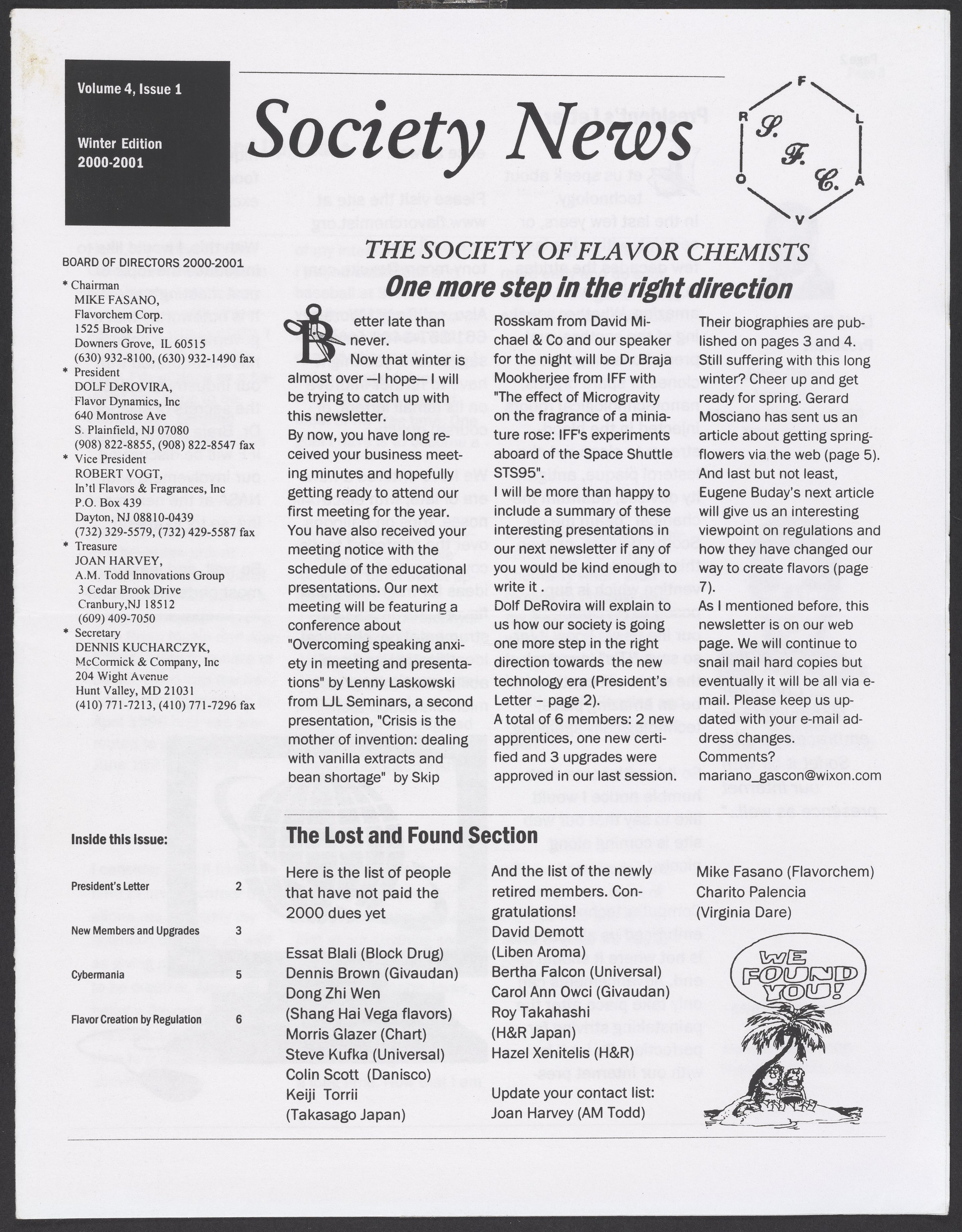 Society of Flavor Chemists. “Society News, Volume 4, Issue 1,” 2000–2001. Society of Flavor Chemists, Society News, Box 1, Folder 2. Science History Institute. Philadelphia. https://digital.sciencehistory.org/works/fqqpvld.