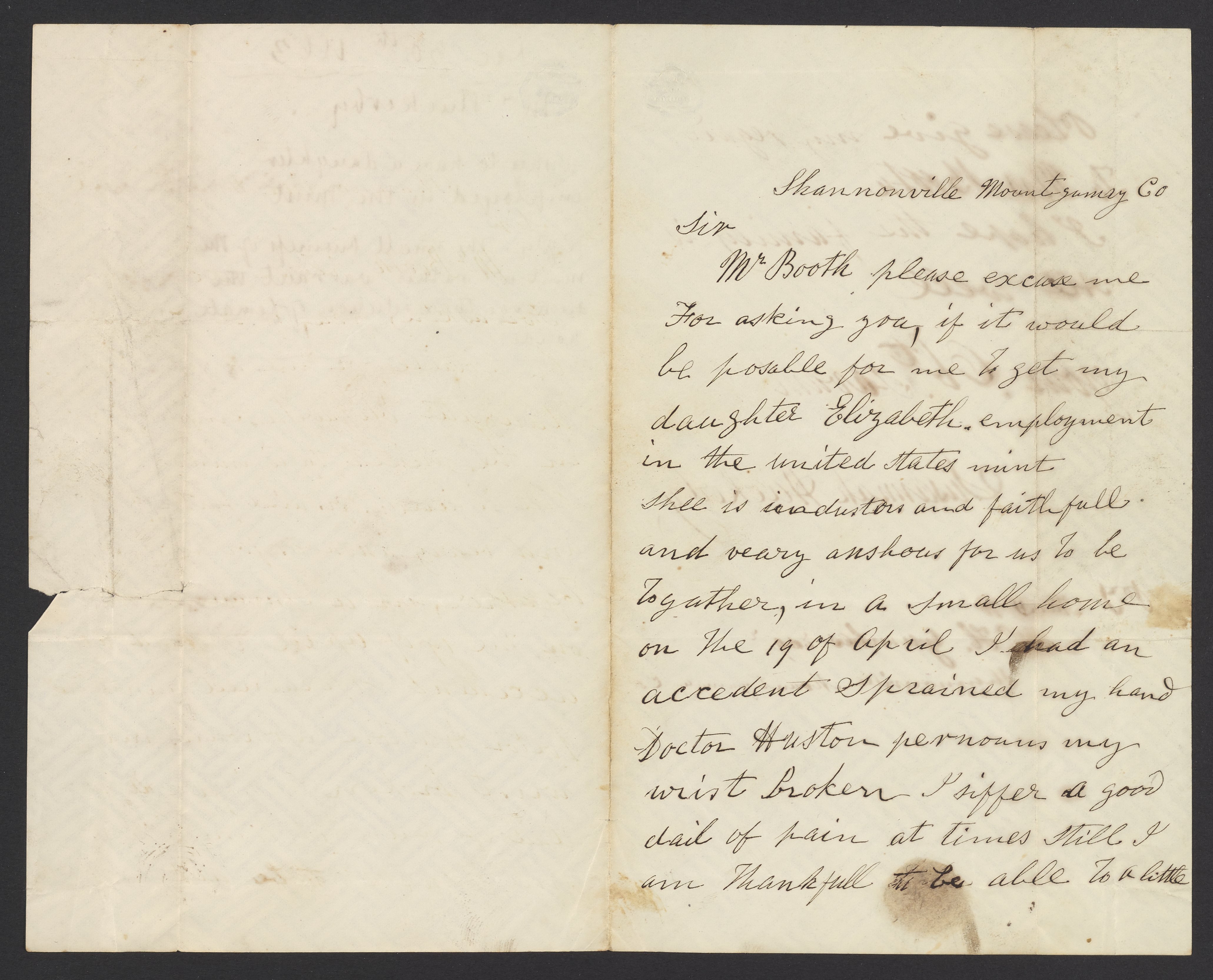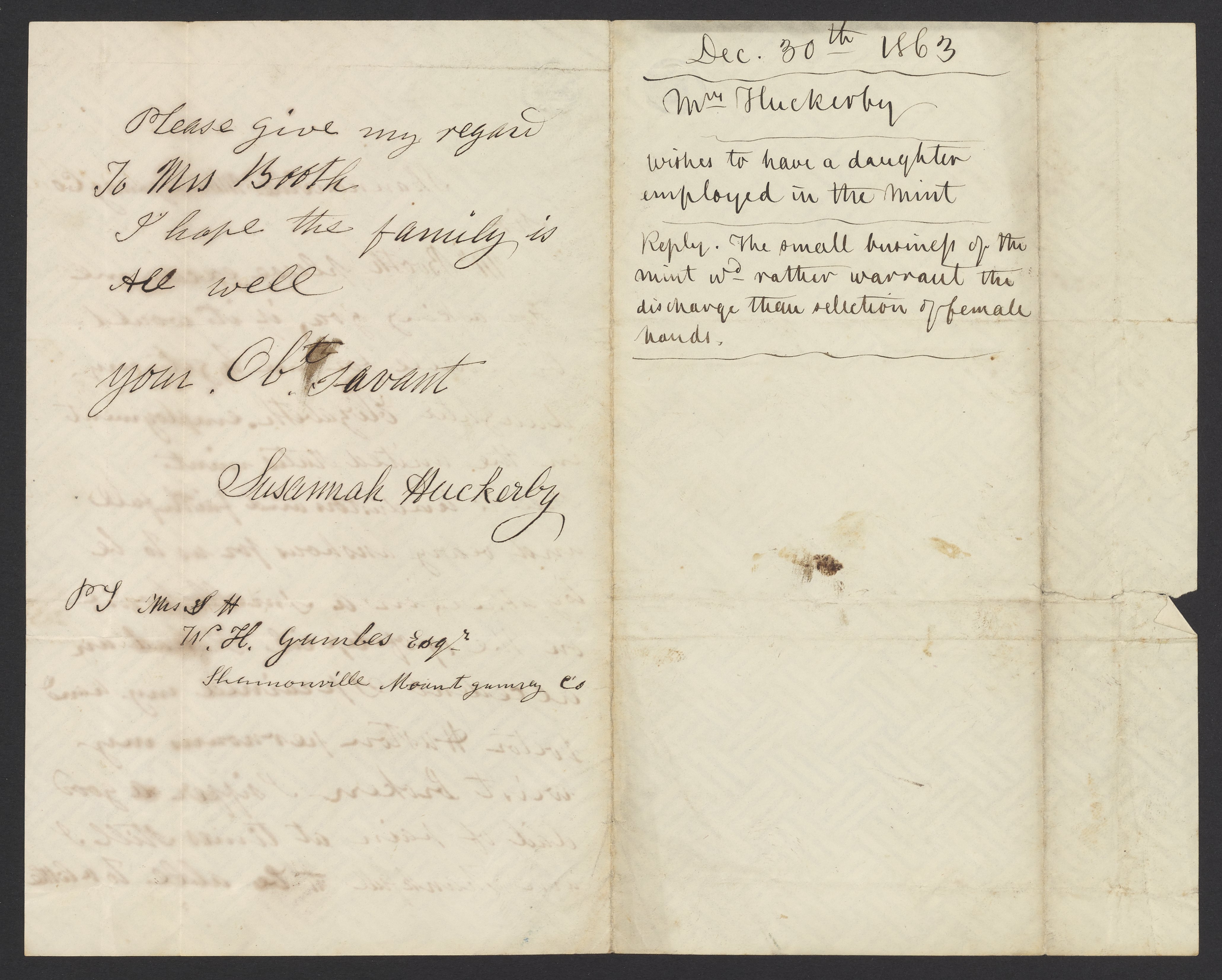 Small JPG1200 x 969px — 149 KBLarge JPG2880 x 2327px — 753 KBFull-sized JPG4122 x 3330px — 1.4 MBOriginal fileTIFF — 4122 x 3330px — 39.3 MBMrs. Sussanah Huckerby writes to James Curtis Booth (1810-1888) with a wish to have a daughter employed in the Mint. Booth notes on the letter "the small business of the Mint would rather warrant the discharge than selection of female hands."