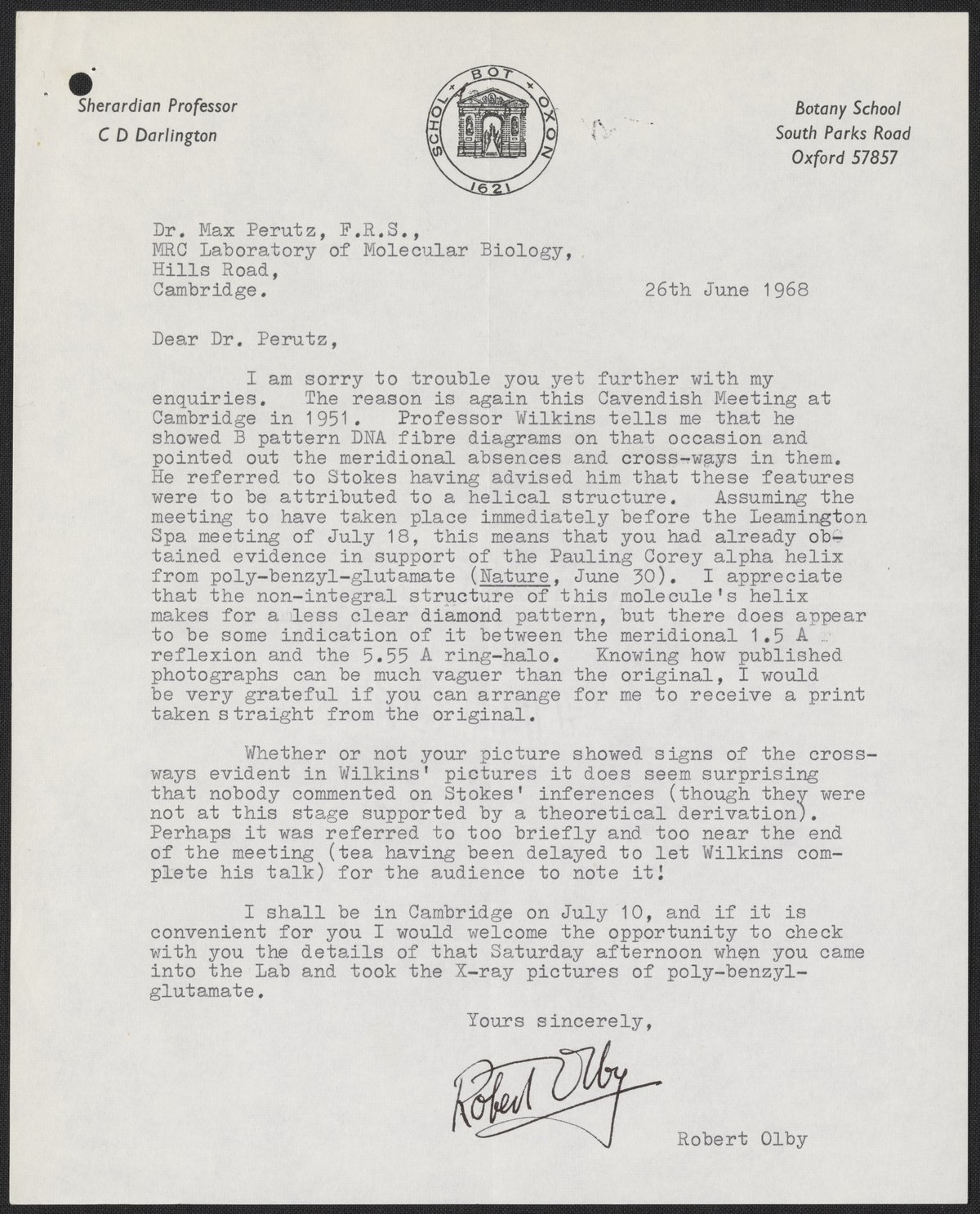 Letter from Robert Olby to Max Perutz, June 26, 1968