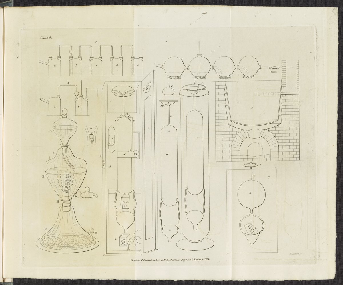 Accum, Friedrich Christian. “Plate 6: Distillatory Apparatus; Gravimeters; Nooth's Apparatus.” In An Explanatory Dictionary of the Apparatus and Instruments Employed in the Various Operations of Philosophical and Experimental Chemistry. London, England: Thomas Shotter Boys, 1824. https://digital.sciencehistory.org/works/ft848q651.