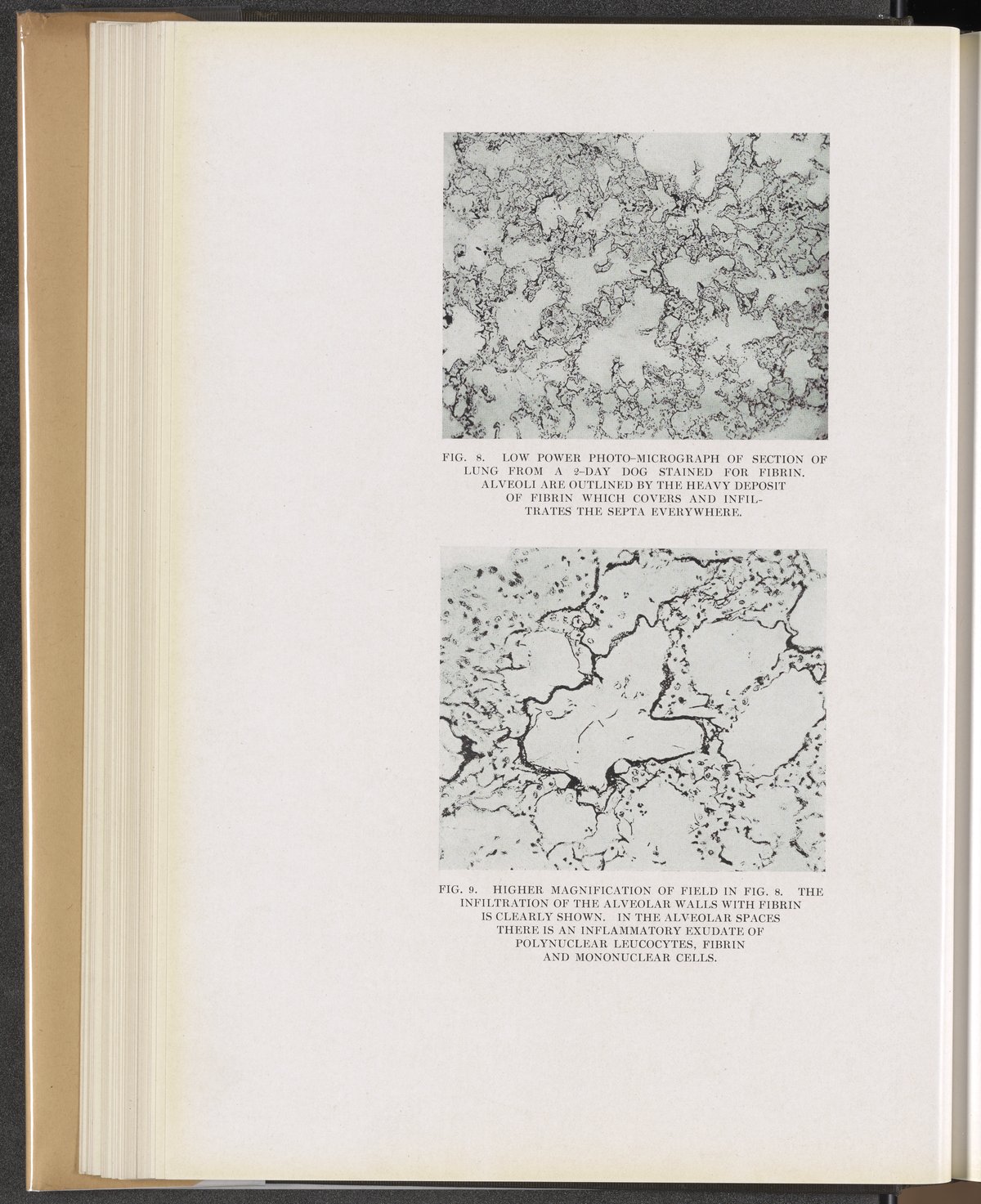 Winternitz, M. C. (Milton C.). “Fig. 8: Low Power Photo-Micrograph of Section of Lung from a ‘2-Day Dog’ Stained for Fibrin. Fig. 9: Higher Magnification of Field in Fig. 8.” Collected Studies on the Pathology of War Gas Poisoning. New Haven, Connecticut: Yale University Press, 1920. https://digital.sciencehistory.org/works/ft848q79c.