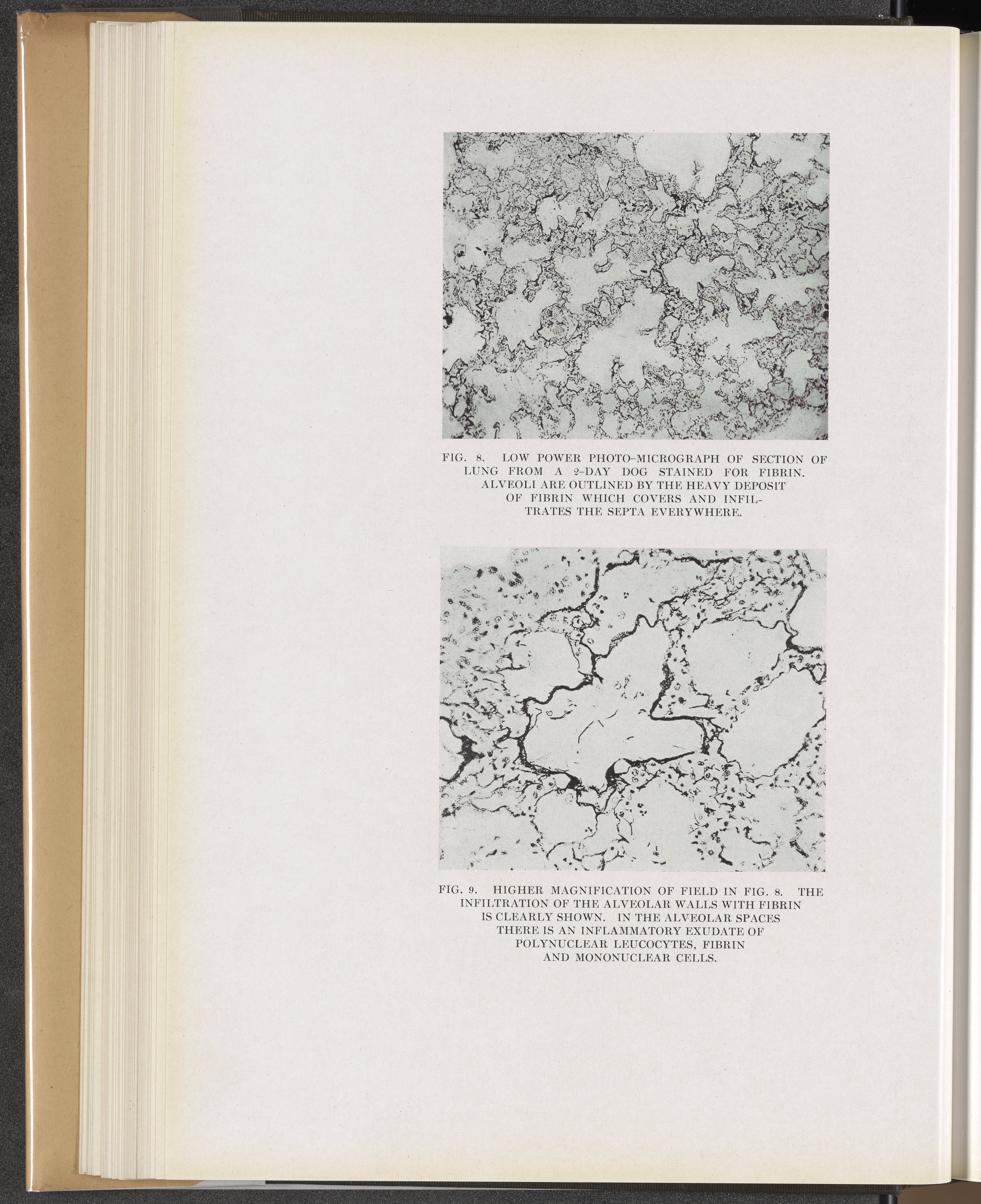 Fig. 8: Low power photo-micrograph of section of lung from a "2-day dog" stained for fibrin. Fig. 9: Higher magnification of field in Fig. 8.