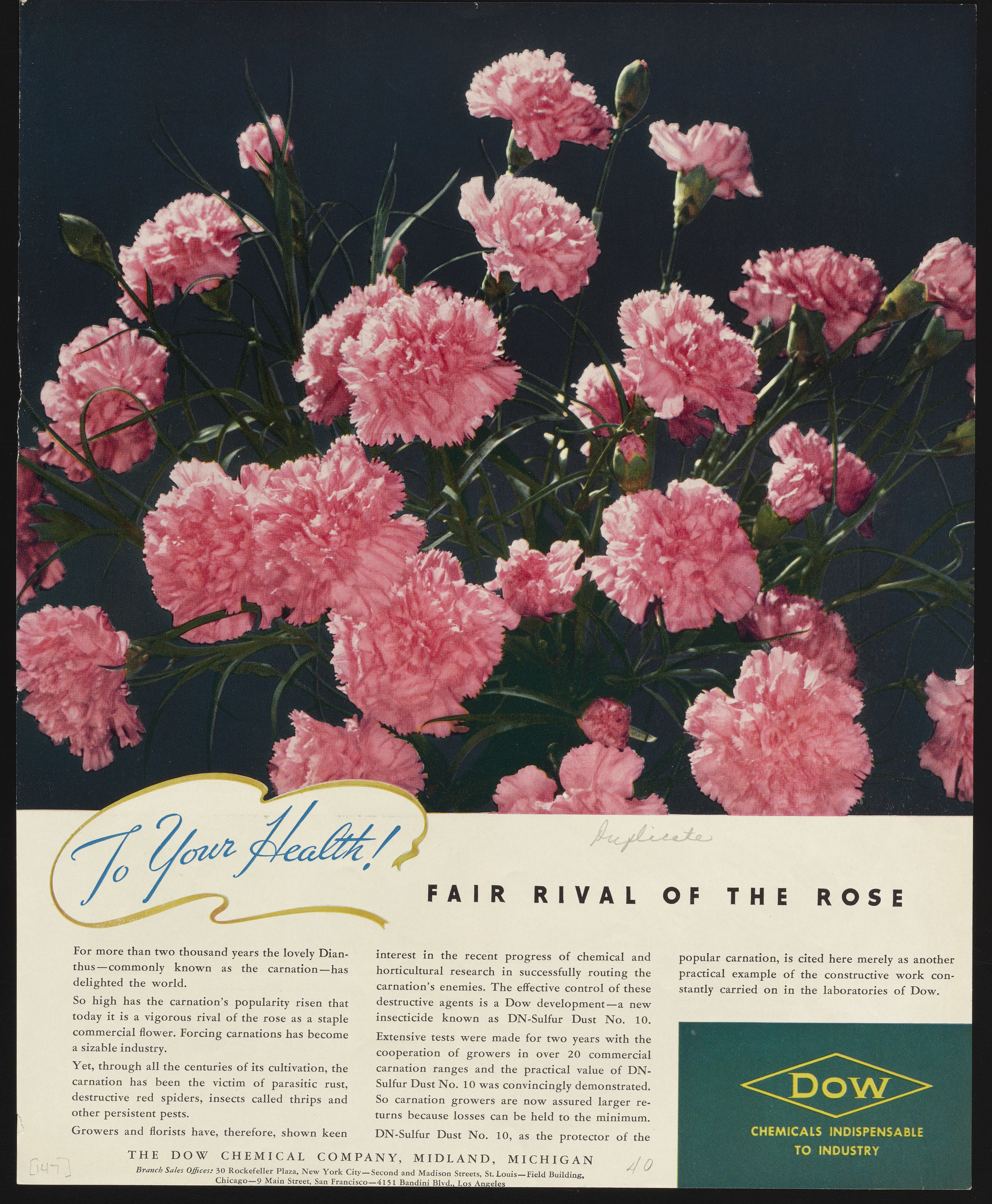 Dow Chemical Company. “To Your Health! Fair Rival of the Rose,” 1940. Advertisements from the Dow Chemical Historical Collection, Box 7. Science History Institute. Philadelphia. https://digital.sciencehistory.org/works/ft848r479.