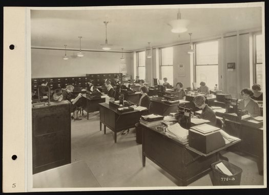 Per notations accompanying the photograph, the employees are identified as follows (left to right): 1) Flo Whetstone; 2) Hazel (Jean) Williams; 3) Mary Marik; 4) Margaret Connelly; 5) Hildegard Hammond; 6) Unidentified; 7) Blanche Robinson; 8) Ruth Bowers; 9) Mary Shields; 10) Esther Fredlund; 11) Unidentified; 12) Elsie Willner; 13) Caroline Hartman; 14) Martha Shippert; 15) Marguerite O'Connor.