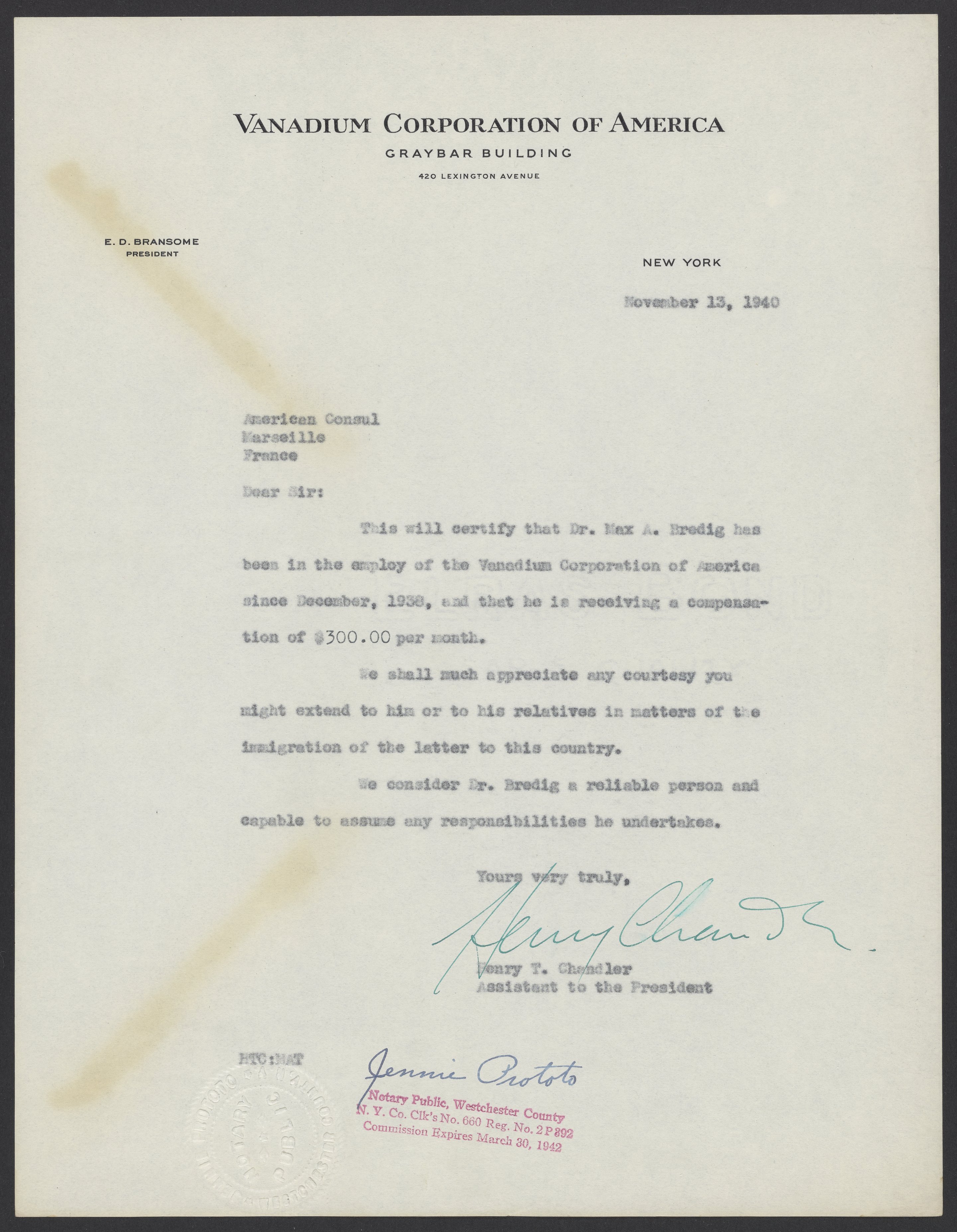 Letter from Henry T. Chandler to the American Consul General in Marseilles, France, confirming that Max Bredig is an employee of the Vanadium Corporation of America and makes $300.00 per month.