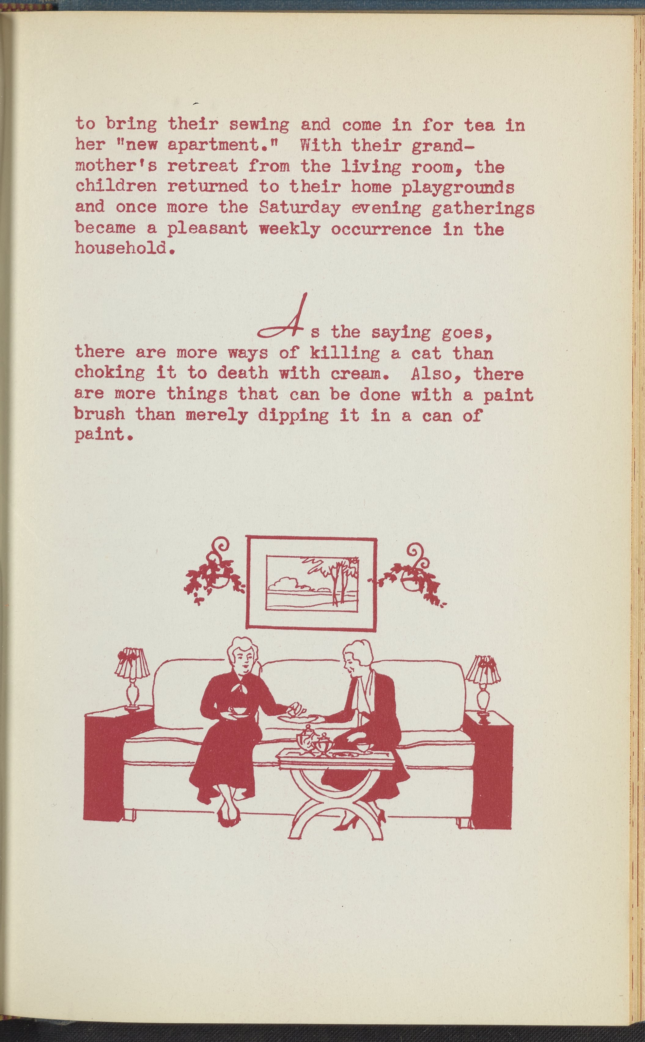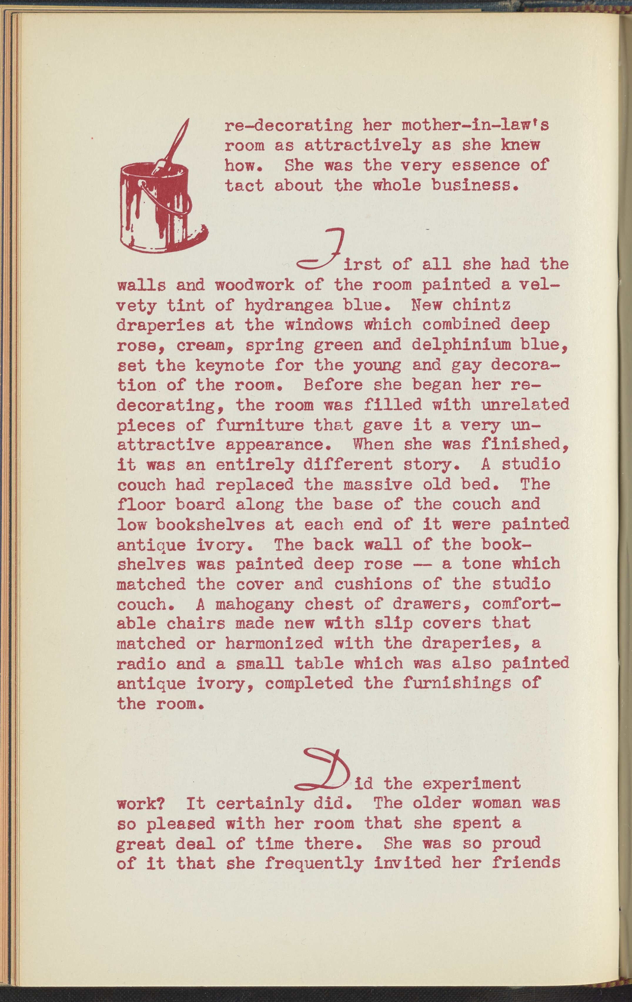Booklet corresponding to a radio broadcast program created by the National Paint, Varnish, and Lacquer Association. The booklet begins by describing a scenario in which a woman shares her home with her elderly mother. The woman decorates her mother's room with old, unwanted furniture. The booklet asserts this as an undesirable outcome, and continues to discuss methods for furnishing and decorating the quarters of a live-in guest such as an elderly parent or in-law. Includes small stylized illustrations throughout and decorated covers.