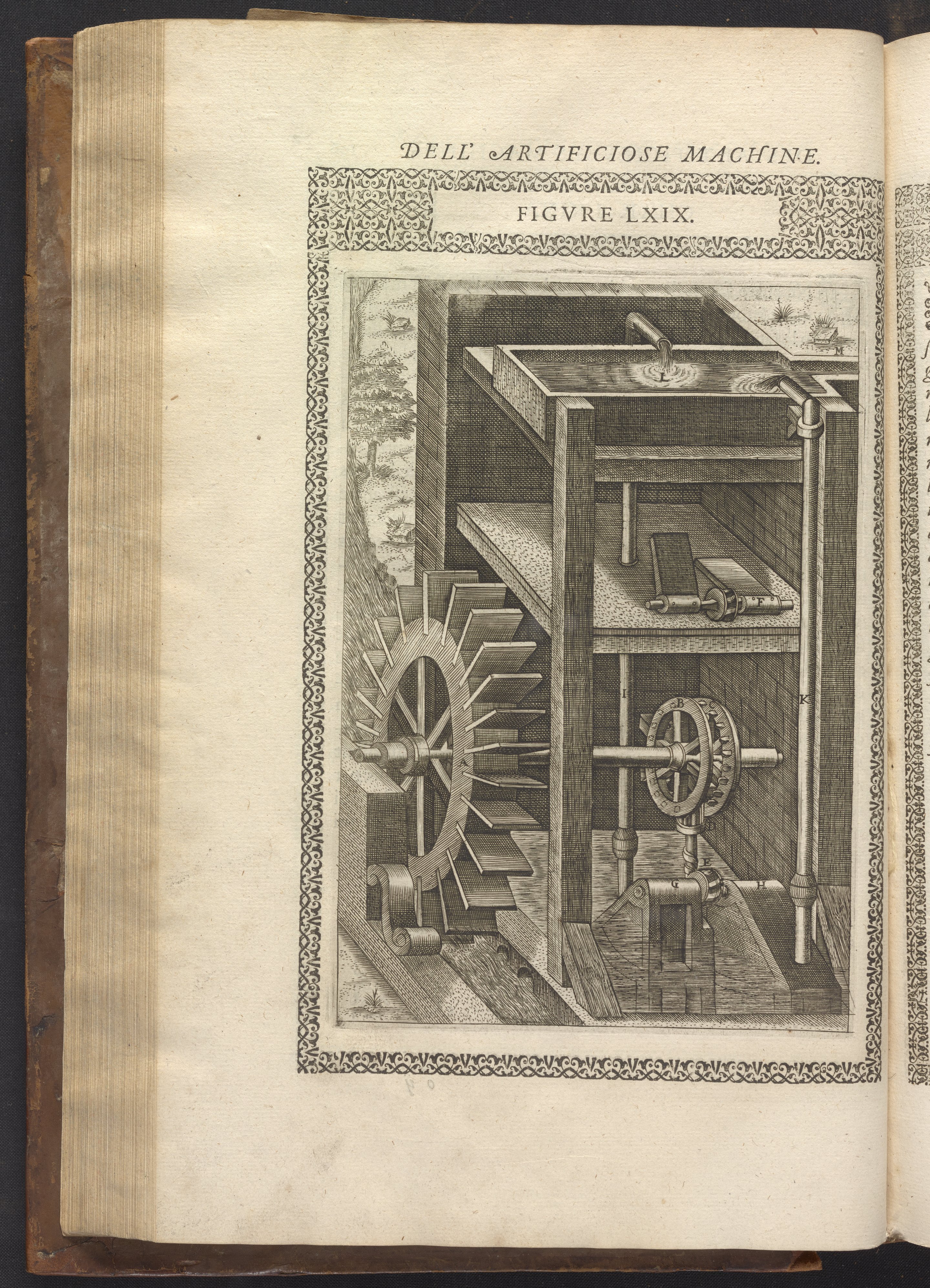 Ramelli, Agostino. “Plate 69: Device for Raising Water from a Low Place by Canal Current.” In Le Diverse Et Artificiose Machine Del Capitano Agostino Ramelli. Paris, France, 1588. https://digital.sciencehistory.org/works/fx719m63q.