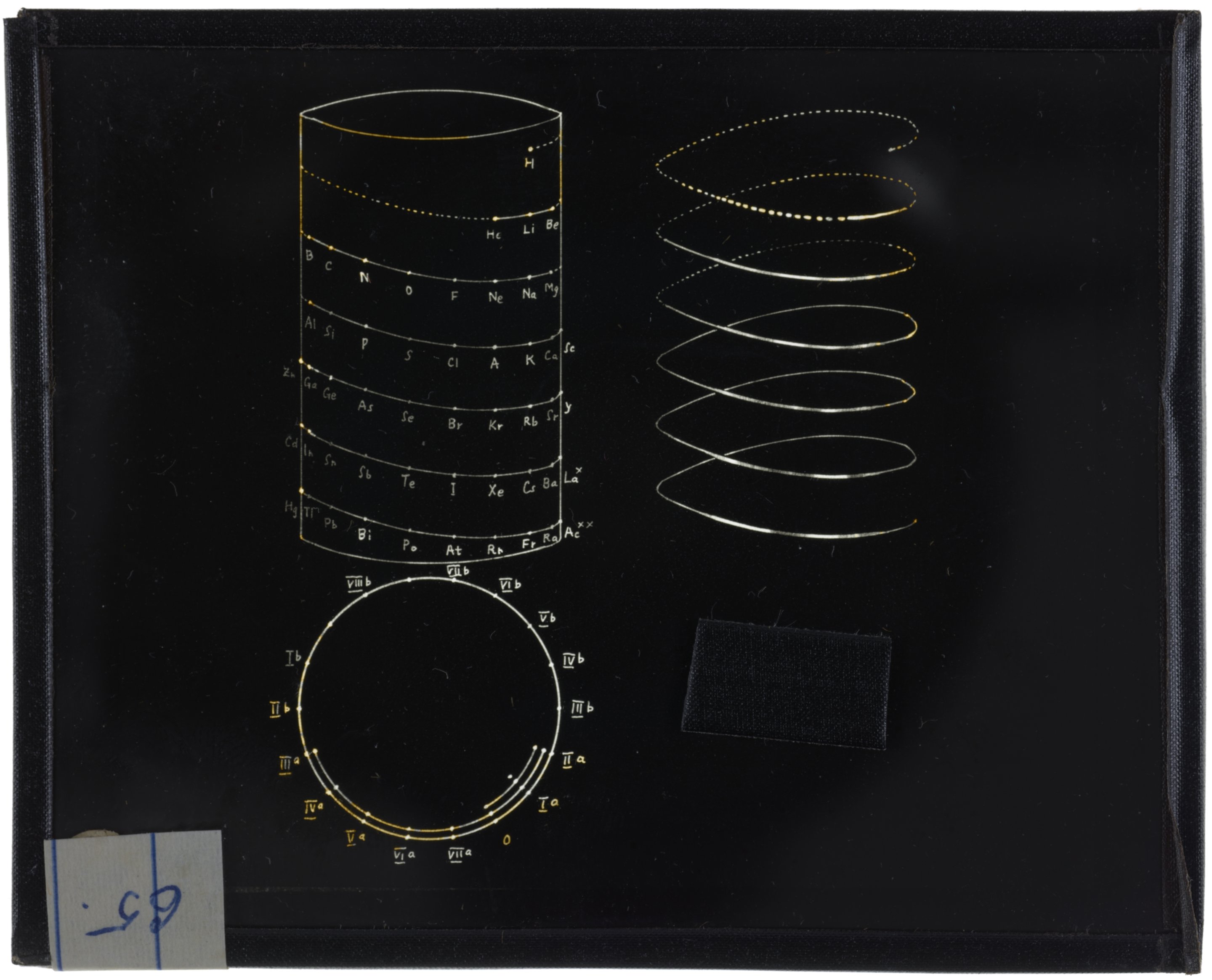 Periodic table in style of helix wound on three main stepwise cylinders1916 (Original design), Circa 1957 (Date attributed to slide)