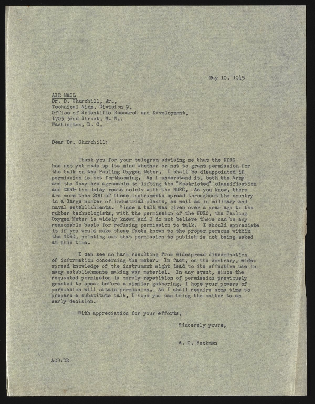 In this letter, Beckman requested permission to discuss the Pauling Oxygen Meter and made the case that the National Defense Research Committee (NDRC) should lift the "Restricted" classification.