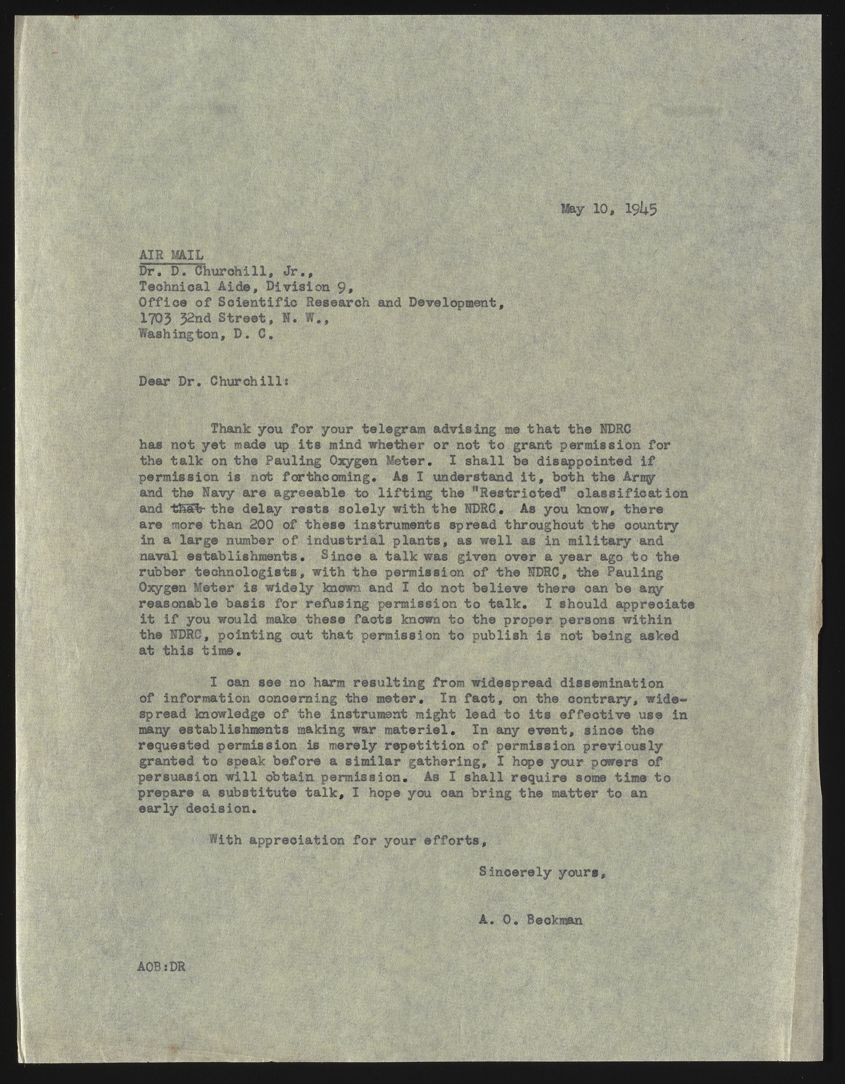 In this letter, Beckman requested permission to discuss the Pauling Oxygen Meter and made the case that the National Defense Research Committee (NDRC) should lift the "Restricted" classification.