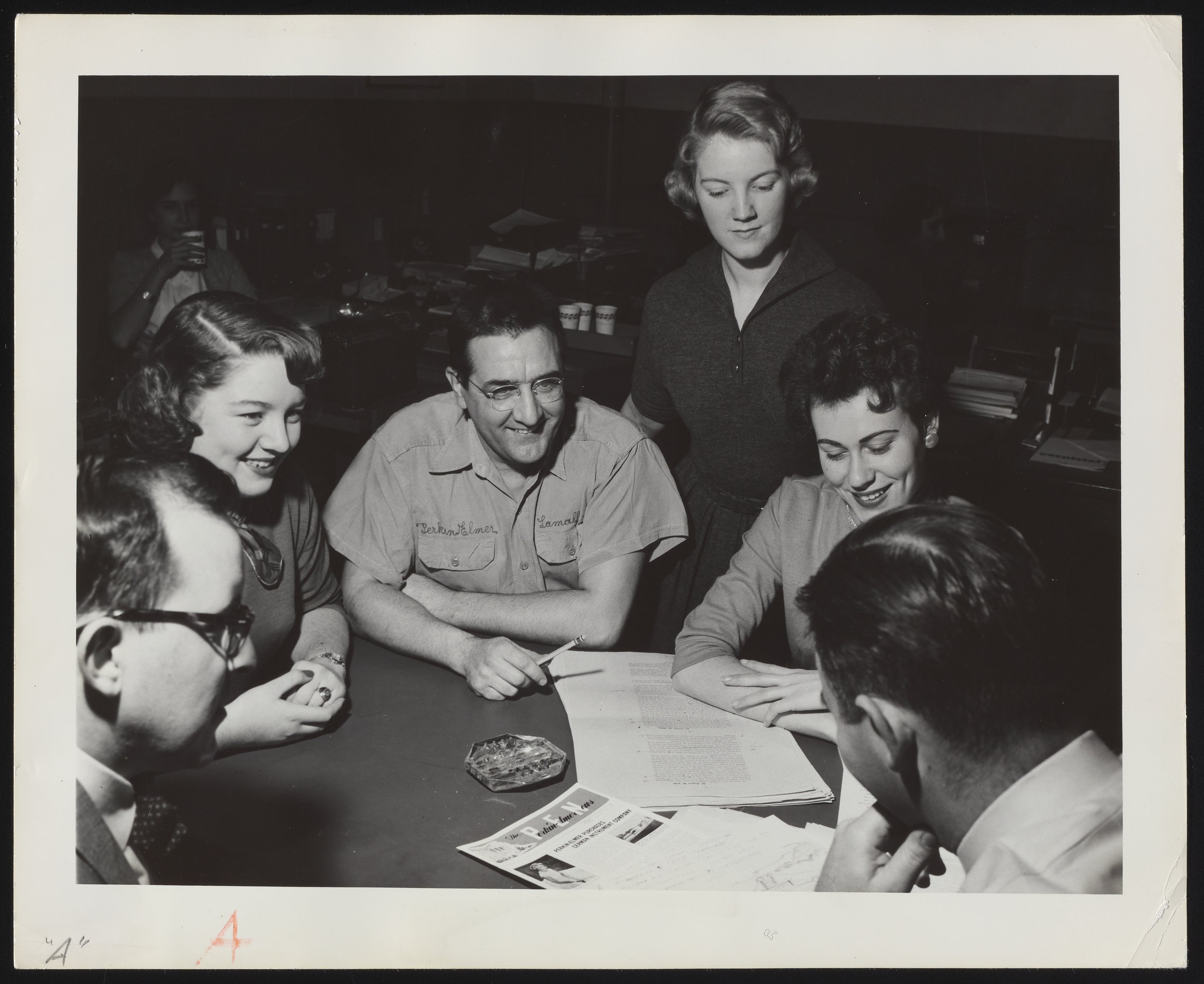 Group photograph of unidentified employees of the Perkin-Elmer Corporation, a manufacturer of analytical instruments, diagnostic tools, and medical imaging equipment. A copy of The Perkin-Elmer News , an in-house publication, announcing the company's acquisition of a German instrument company (Askania GmbH) is visible at the center of the table.