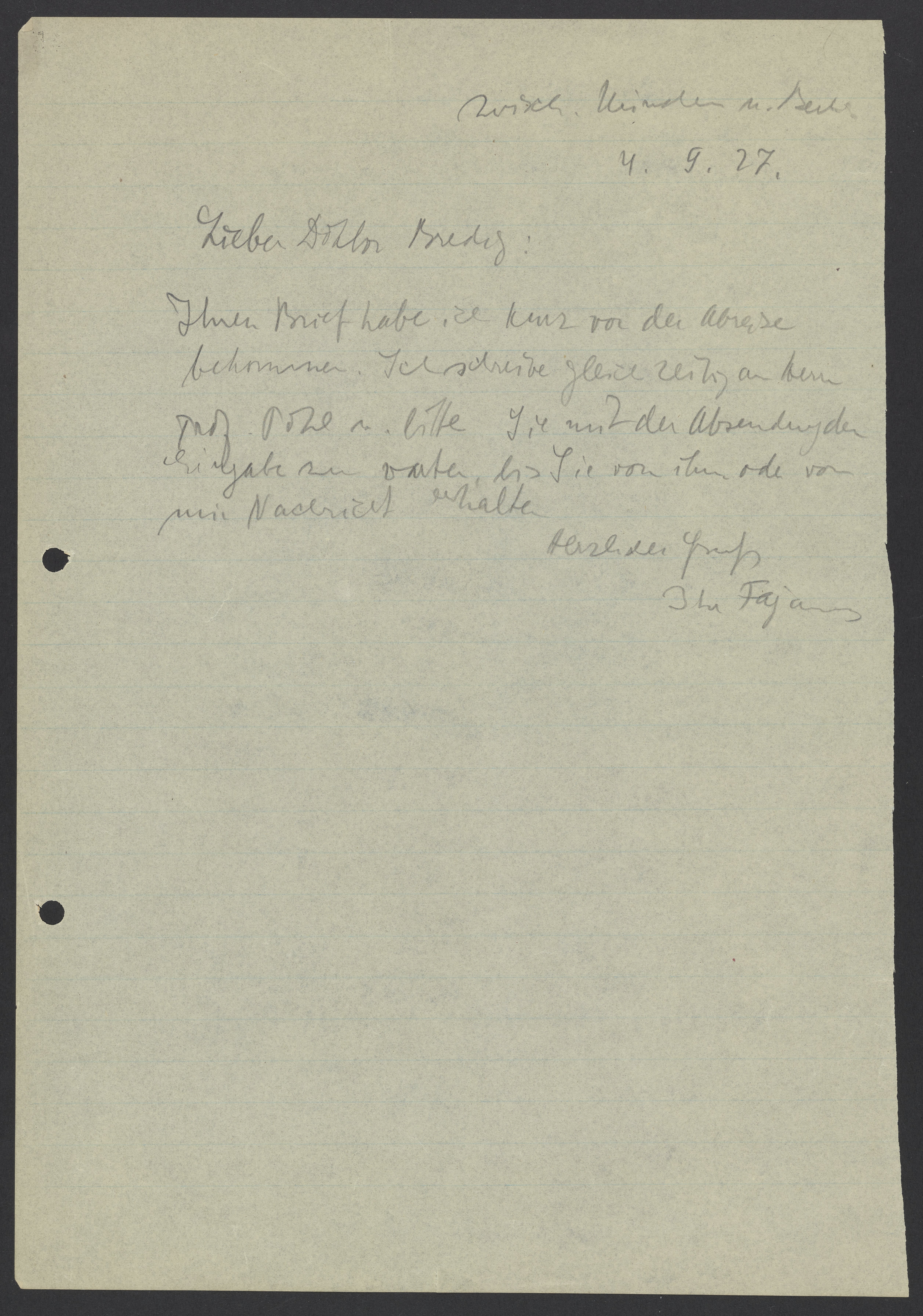 Letter from Kasimir Fajans to Max Bredig, September 4, 1927