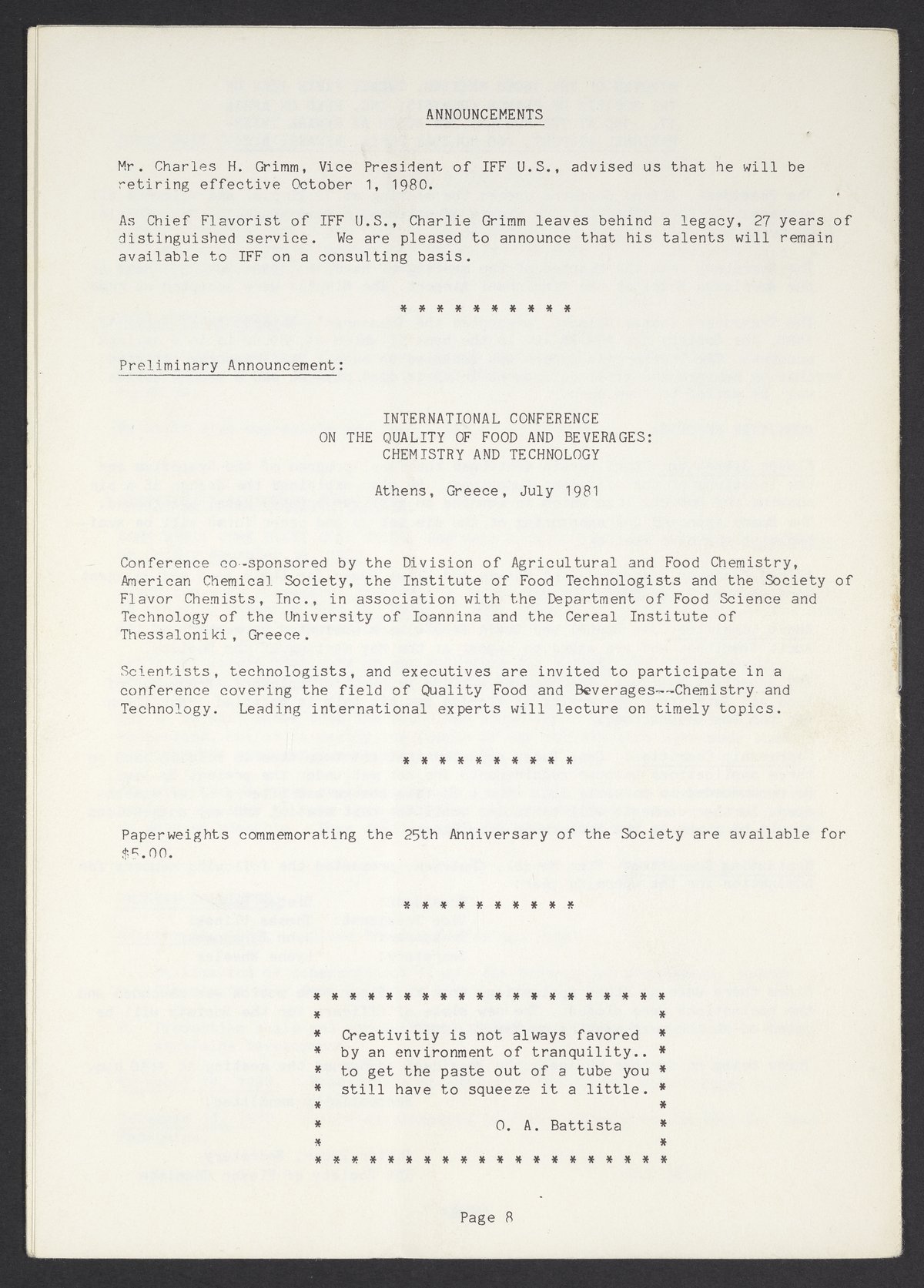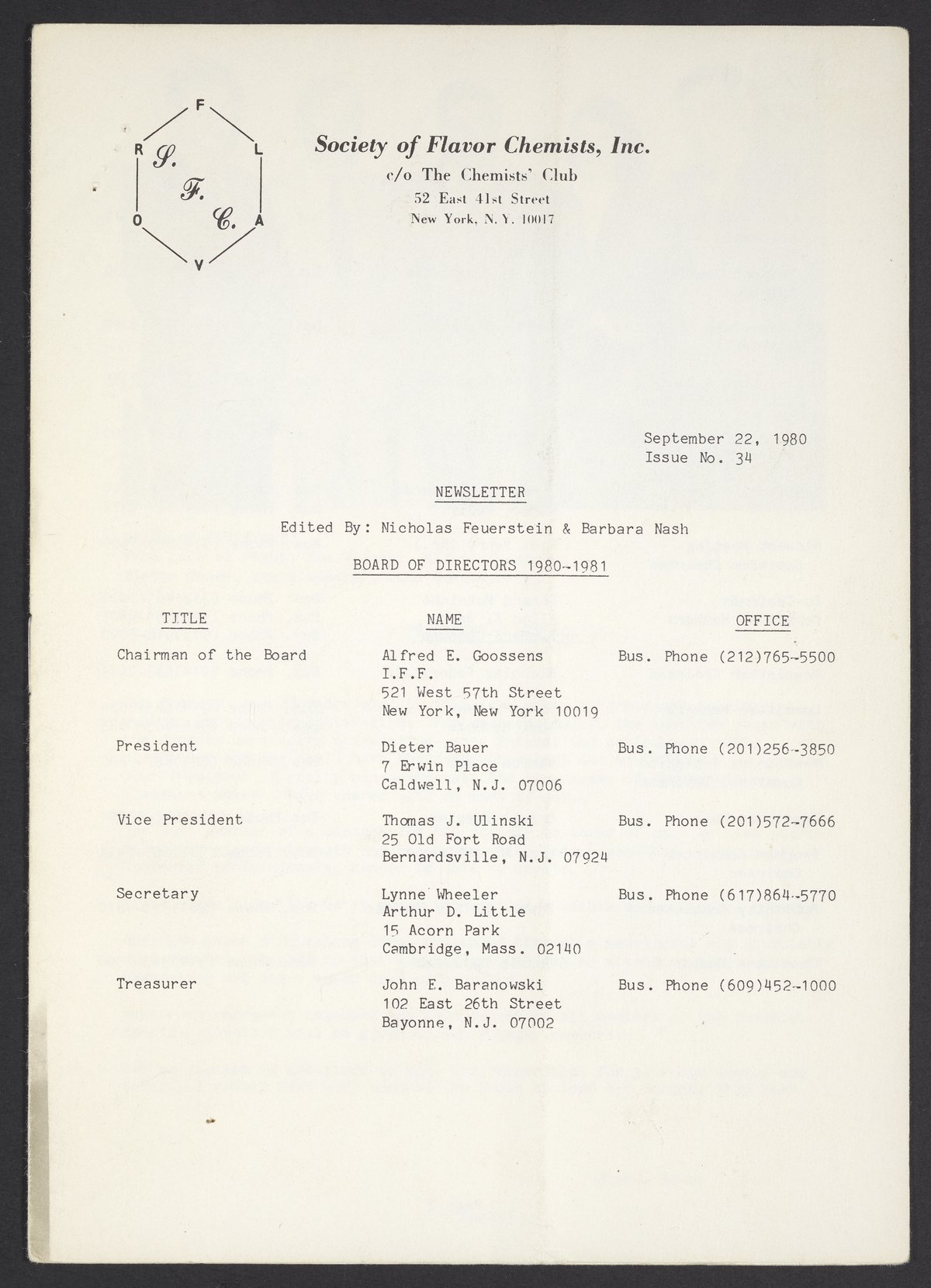 Society of Flavor Chemists. “Society of Flavor Chemists Newsletter, September 1980,” September 22, 1980. Society of Flavor Chemists Newsletters and Certificate of Incorporation, Box 1, Folder 1. Science History Institute. Philadelphia. https://digital.sciencehistory.org/works/fziduc9.