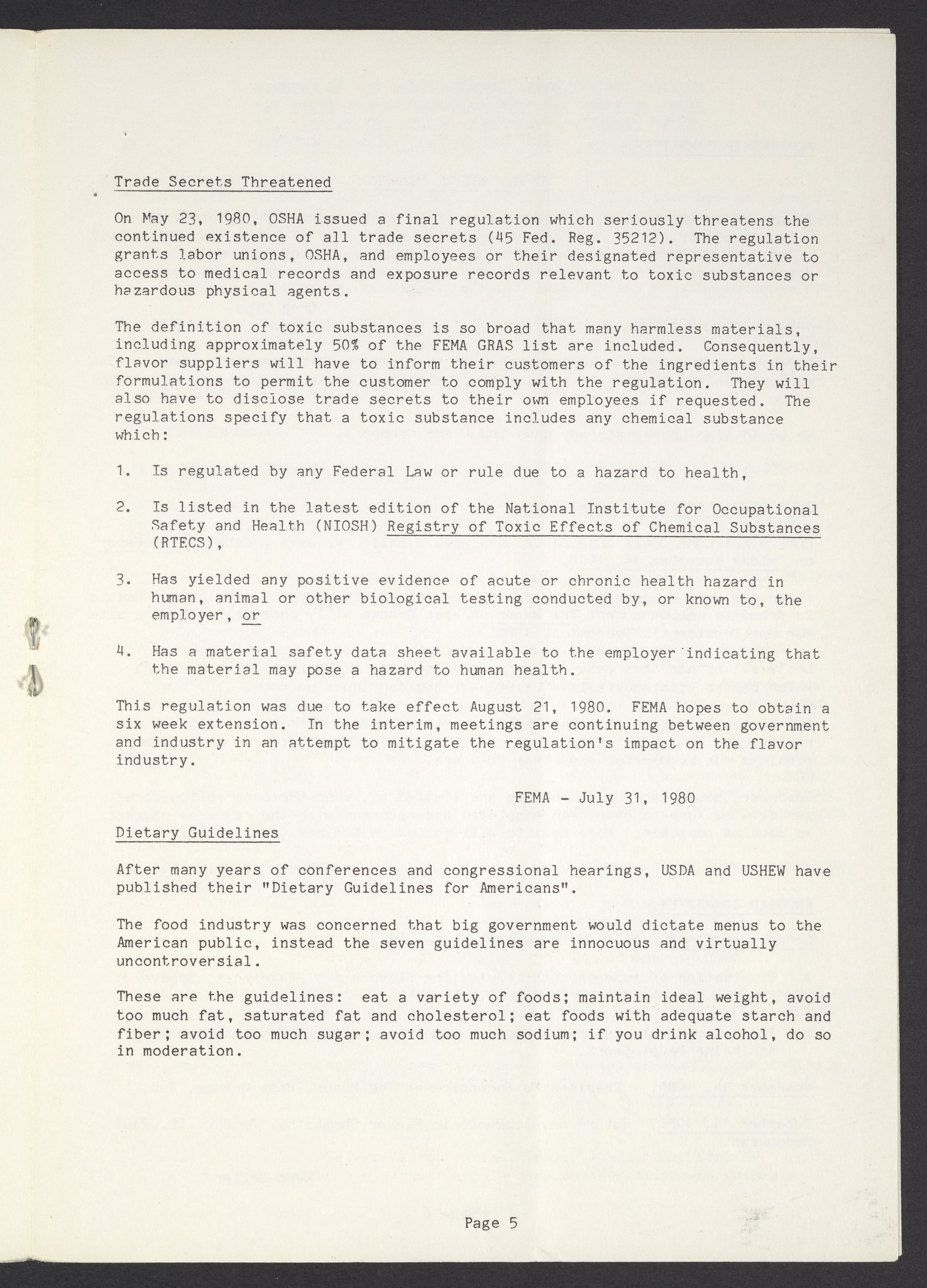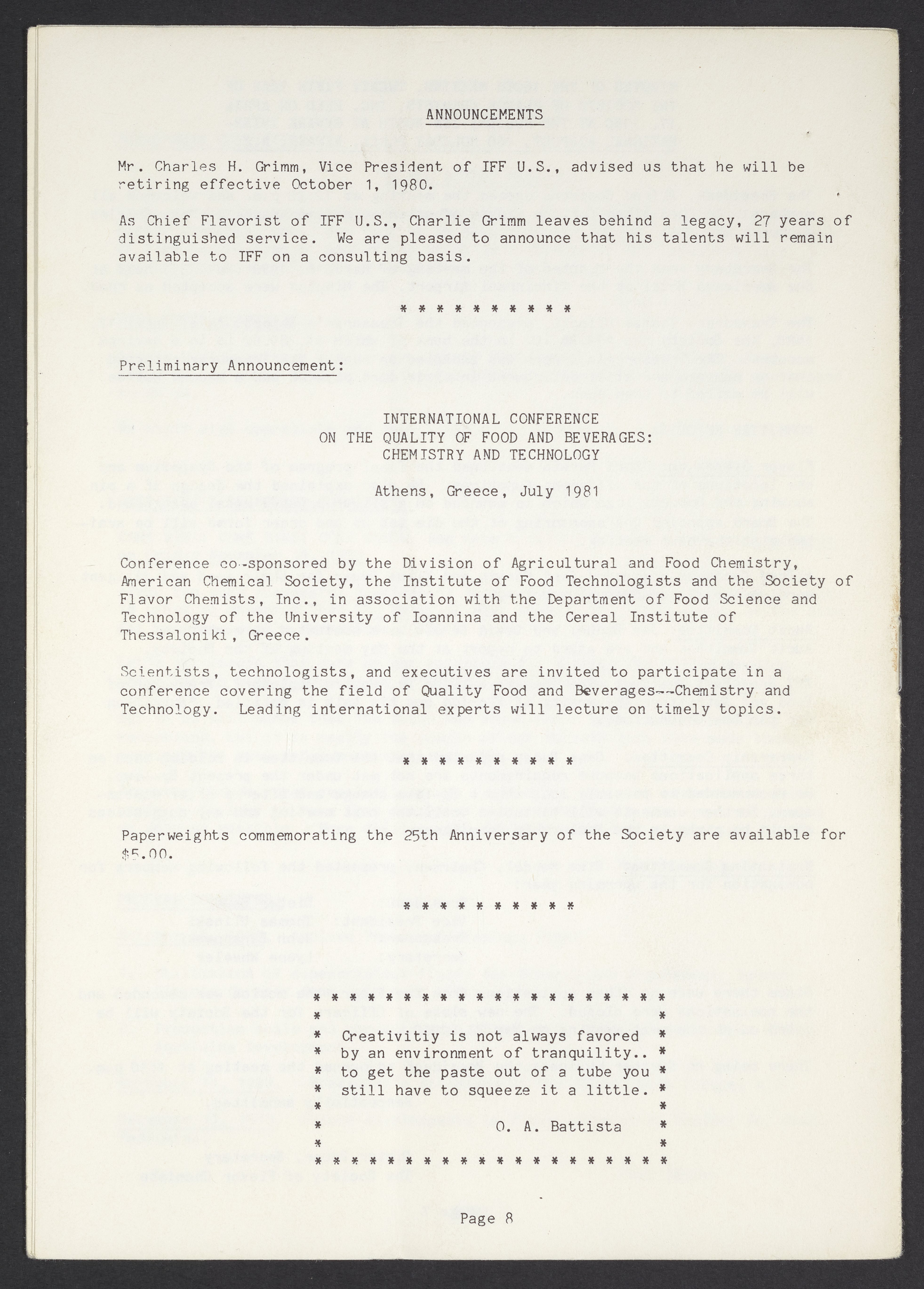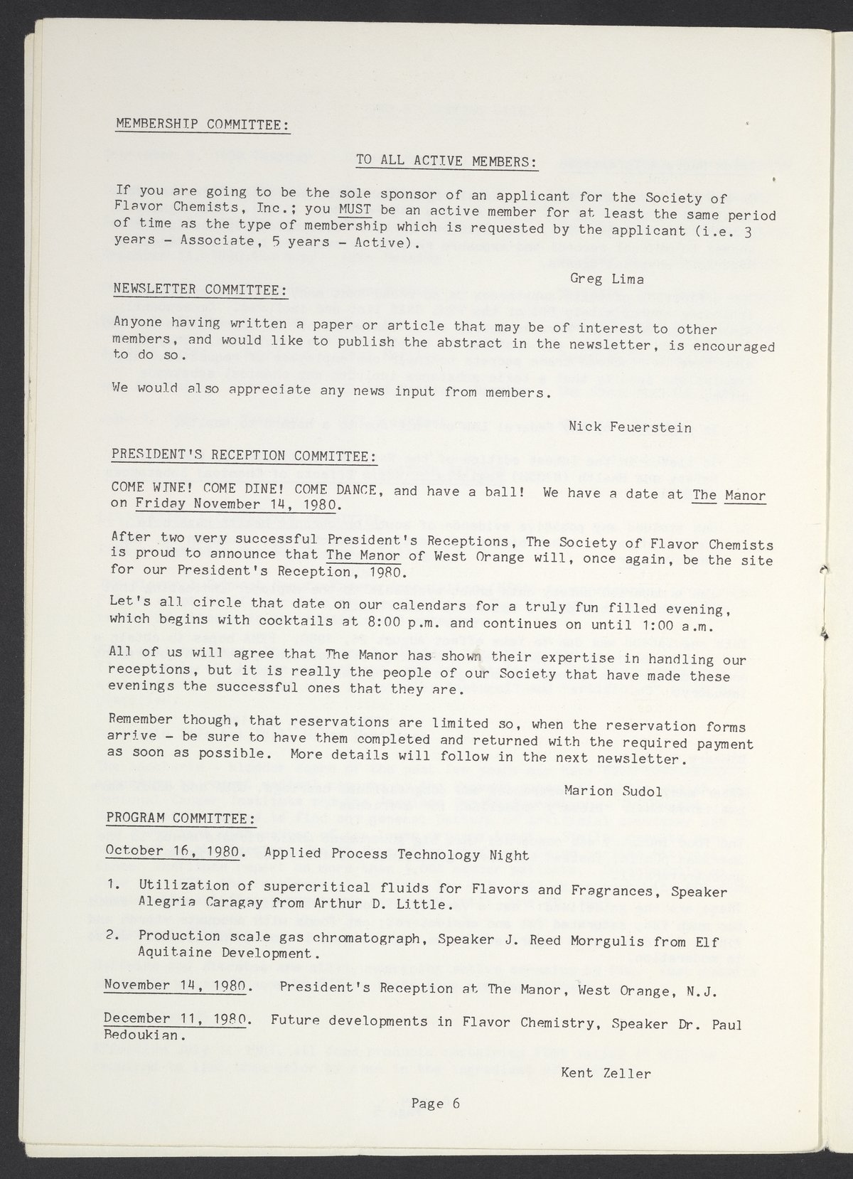Society of Flavor Chemists. “Society of Flavor Chemists Newsletter, September 1980,” September 22, 1980. Society of Flavor Chemists Newsletters and Certificate of Incorporation, Box 1, Folder 1. Science History Institute. Philadelphia. https://digital.sciencehistory.org/works/fziduc9.
