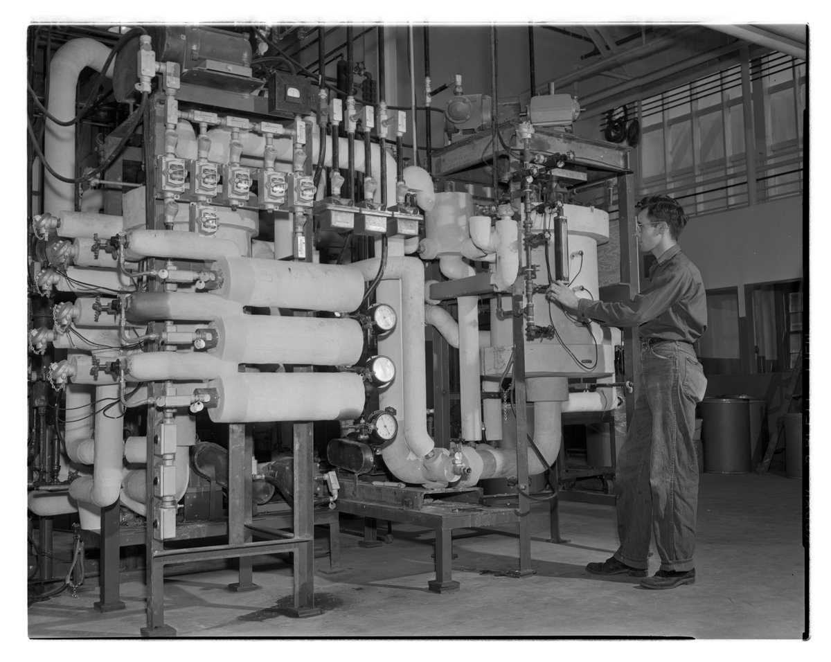Dow Chemical Company. “Willard King Working with Pilot Plant Apparatus at Dow Plastics Production Laboratory,” June 13, 1956. Dow Chemical Company Historical Image Collection, Box 8, Folder Plants--Plastics Production Laboratory. Science History Institute. Philadelphia. https://digital.sciencehistory.org/works/g158bh82g.