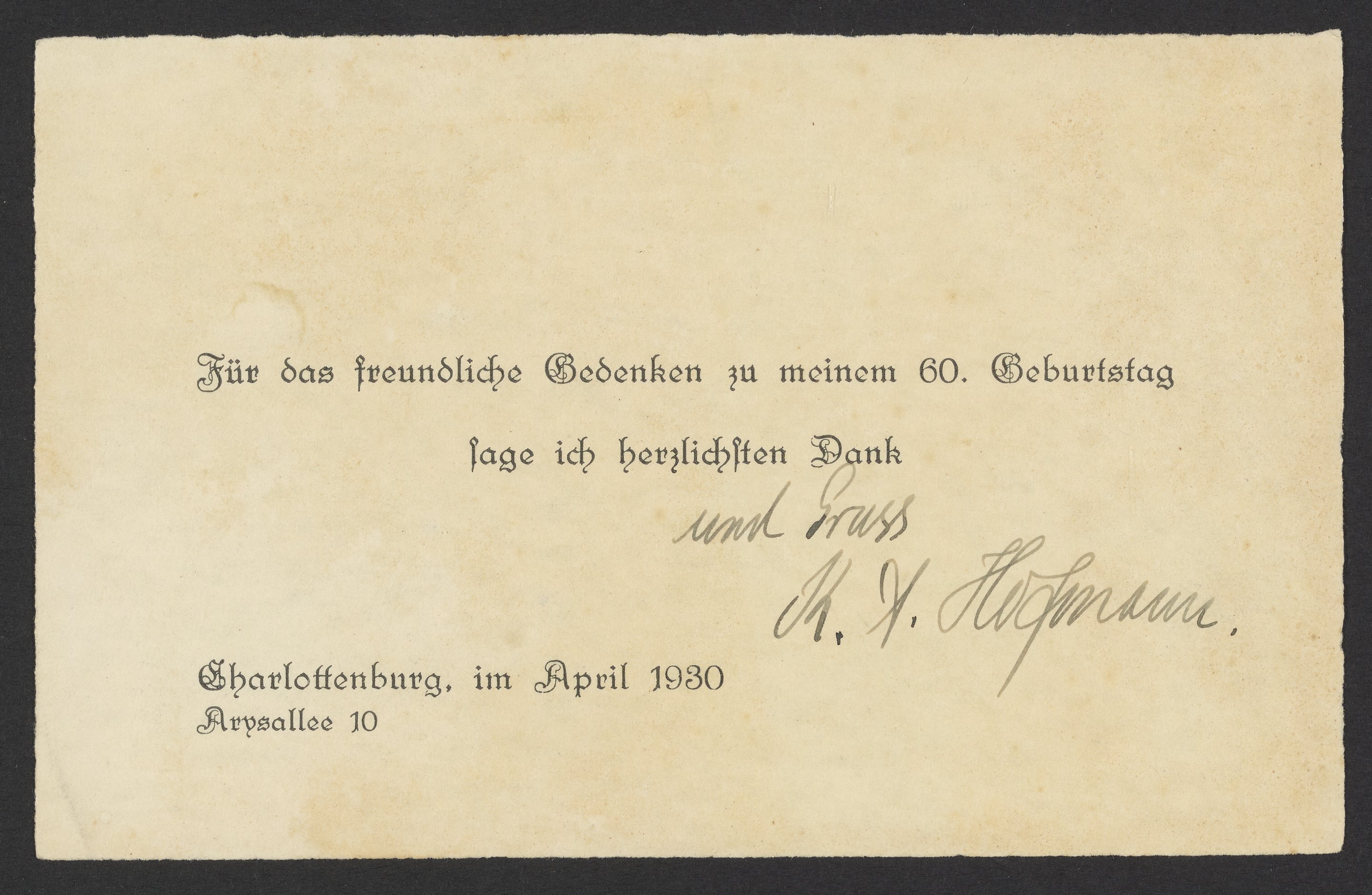 Hofmann, Karl Andreas. “Karl Andreas Hofmann's Personal Calling Card,” April 1930. Papers of Georg and Max Bredig, Box 3, Folder 18. Science History Institute. Philadelphia. https://digital.sciencehistory.org/works/g1q701g.