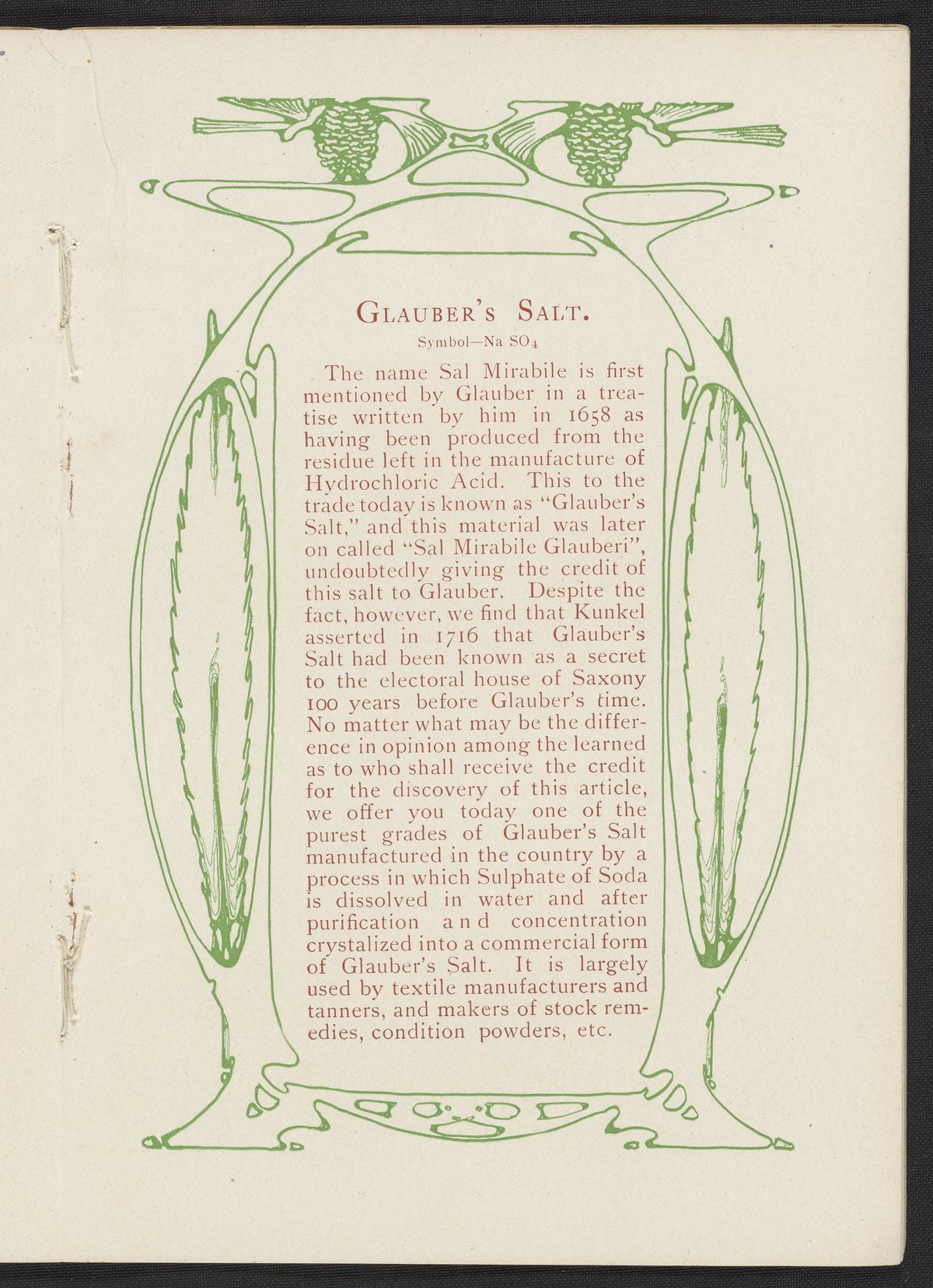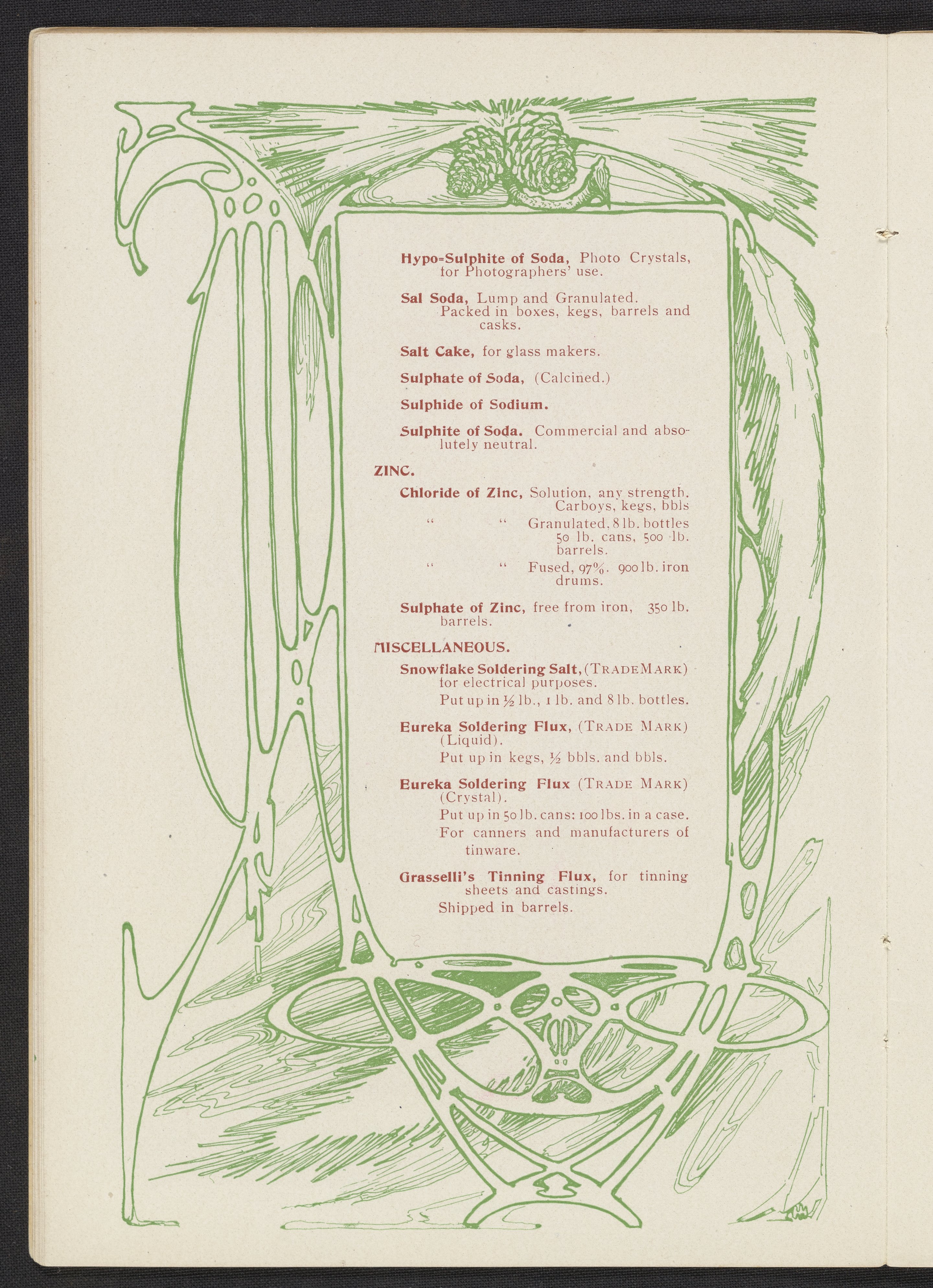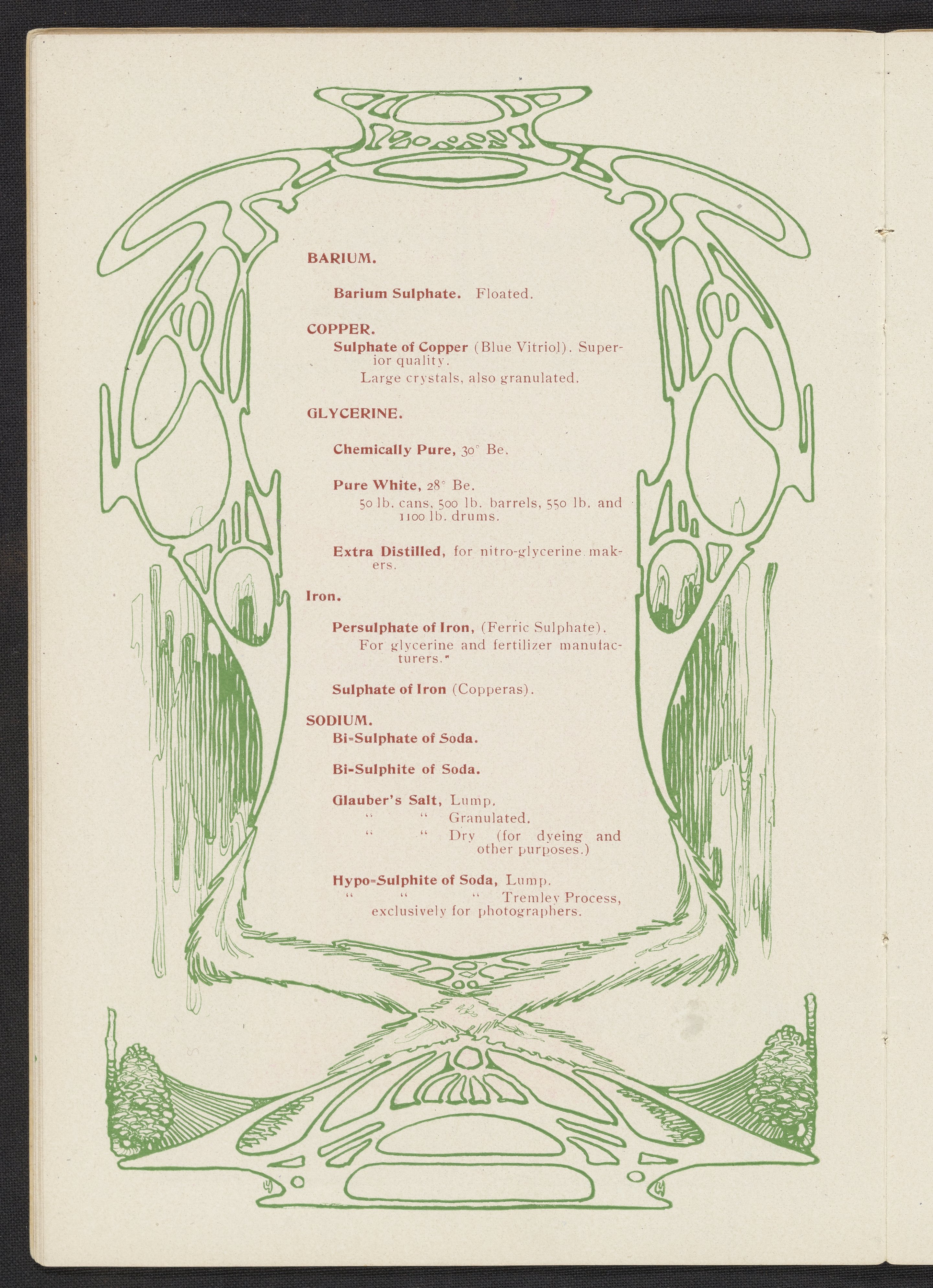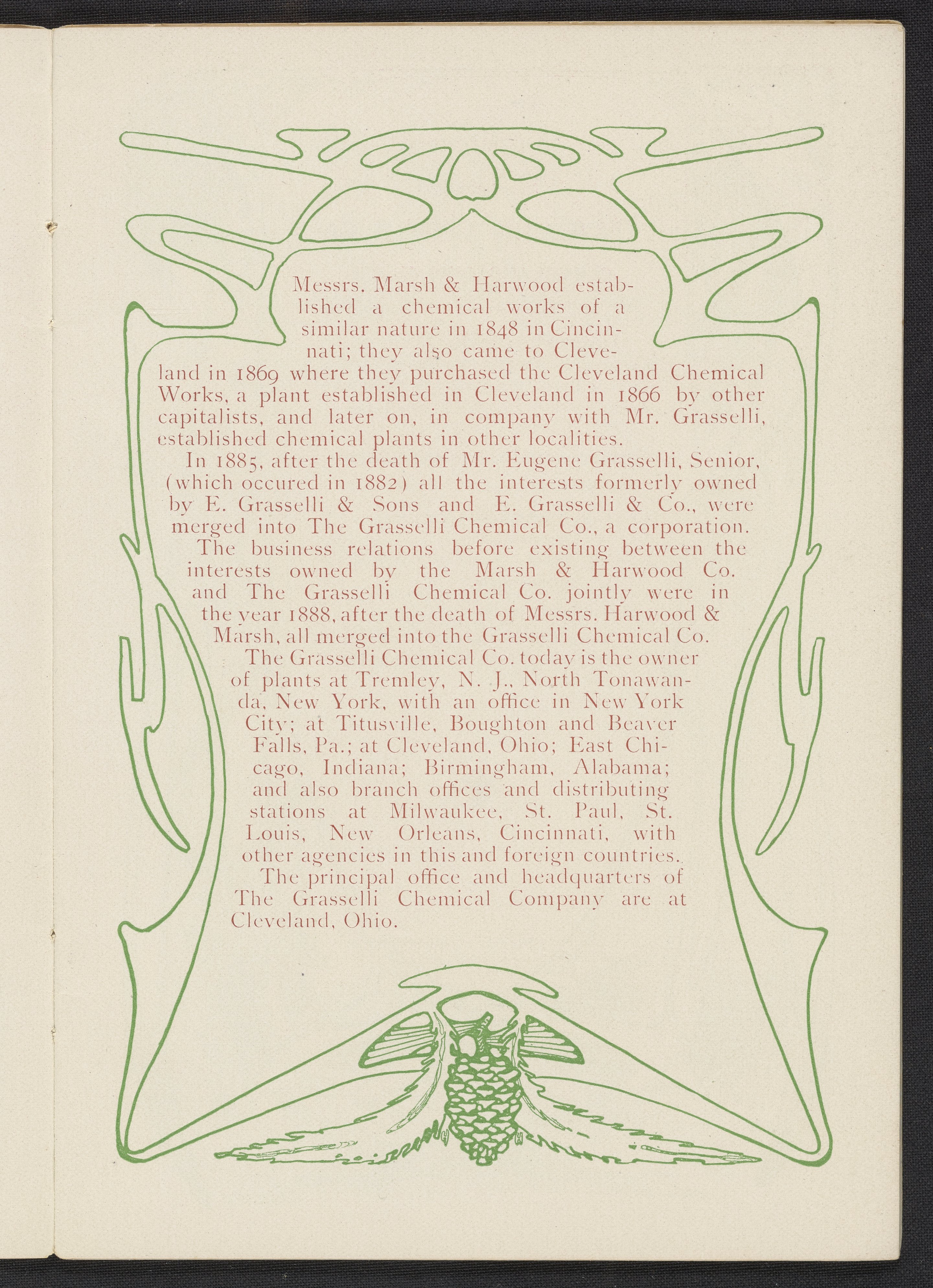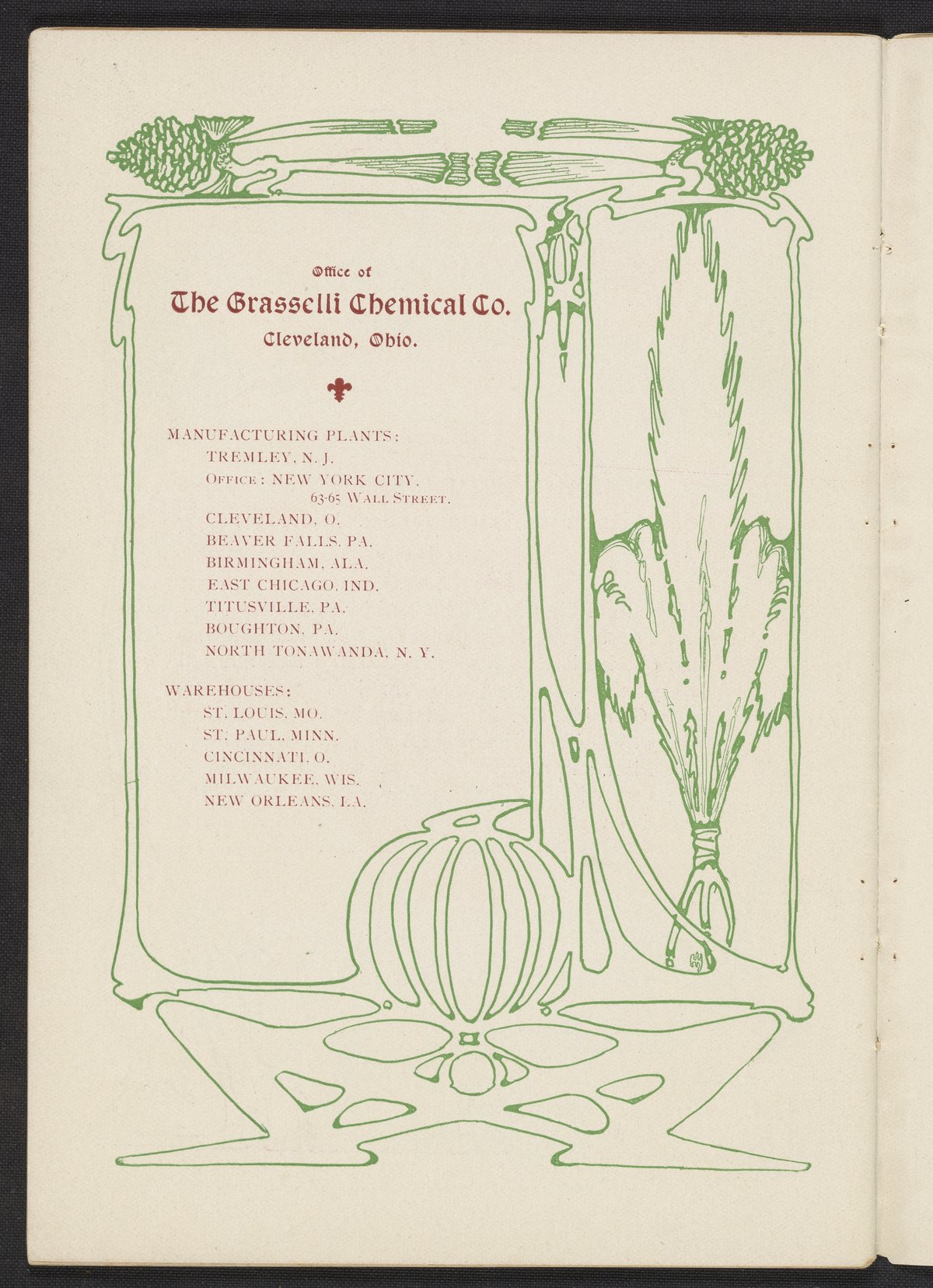 Small JPG1200 x 1704px — 634 KBLarge JPG2880 x 4089px — 4.8 MBFull-sized JPG3483 x 4945px — 6.7 MBOriginal fileTIFF — 3483 x 4945px — 49.3 MBThis is a chemical catalog for the Grasselli Chemical Company in Cleveland, Ohio. It includes a short company history, a list of chemicals manufactured by the company, and summaries on the history and use of some of the chemicals. Throughout the pamphlet there are allegorical illustrations in the art nouveau style. Many of the illustrations are signed C. H. Crittenden.