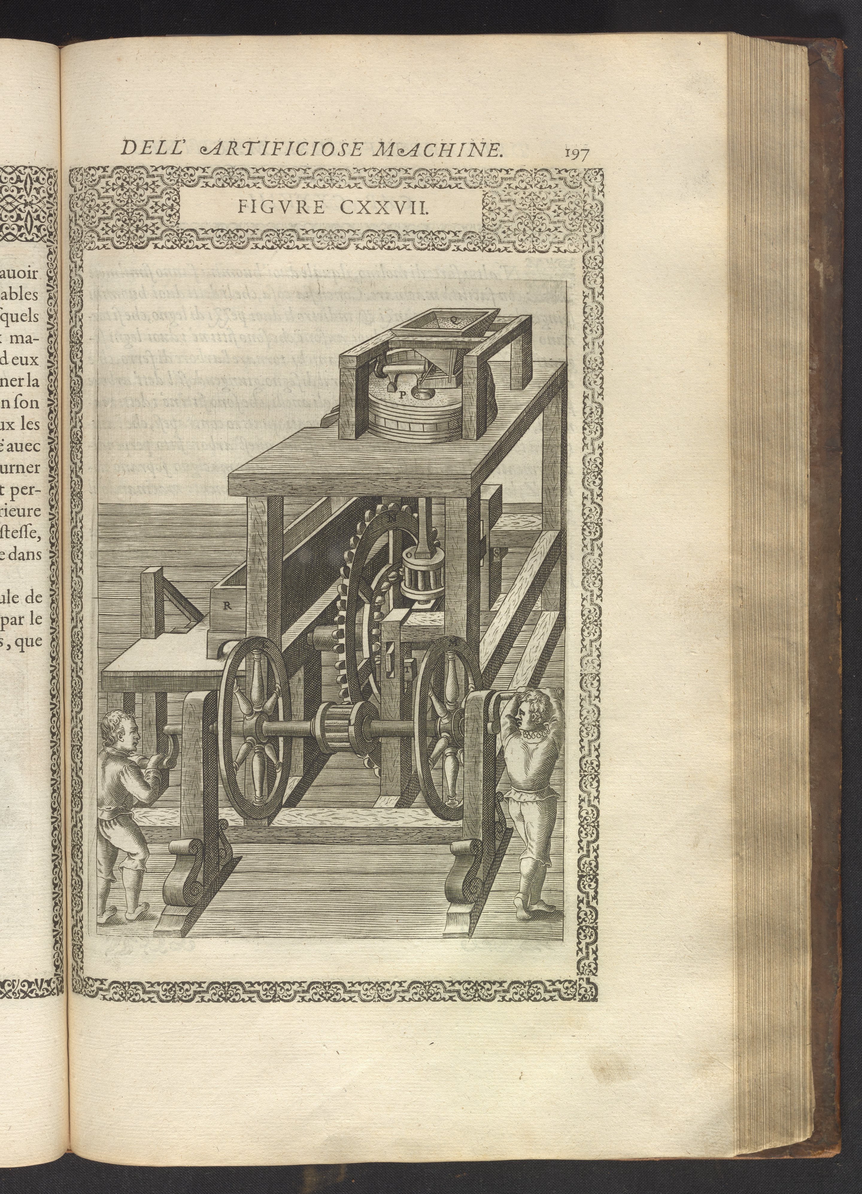 Ramelli, Agostino. “Plate 127: Grain Mill Powered by Two Men.” In Le Diverse Et Artificiose Machine Del Capitano Agostino Ramelli. Paris, France, 1588. https://digital.sciencehistory.org/works/g445cd33s.