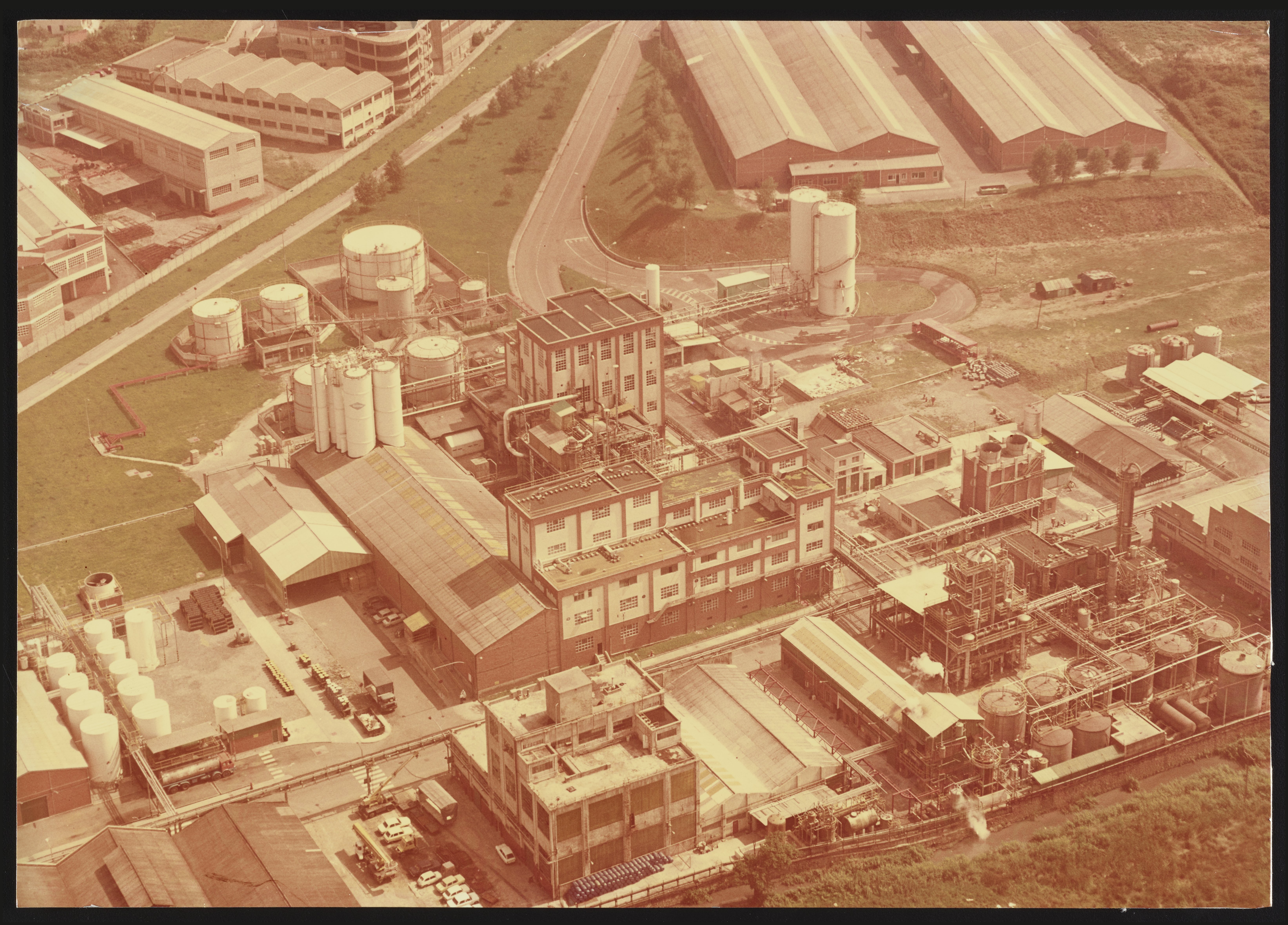 Aerial view of a section of the Dow Chemical Company's polystyrene plant located in Cartagena, Colombia. Constructed in the 1960s, the Cartagena plant subsequently underwent four expansions and boasted a manufacturing capacity of 45,00 metric tons by 1985.