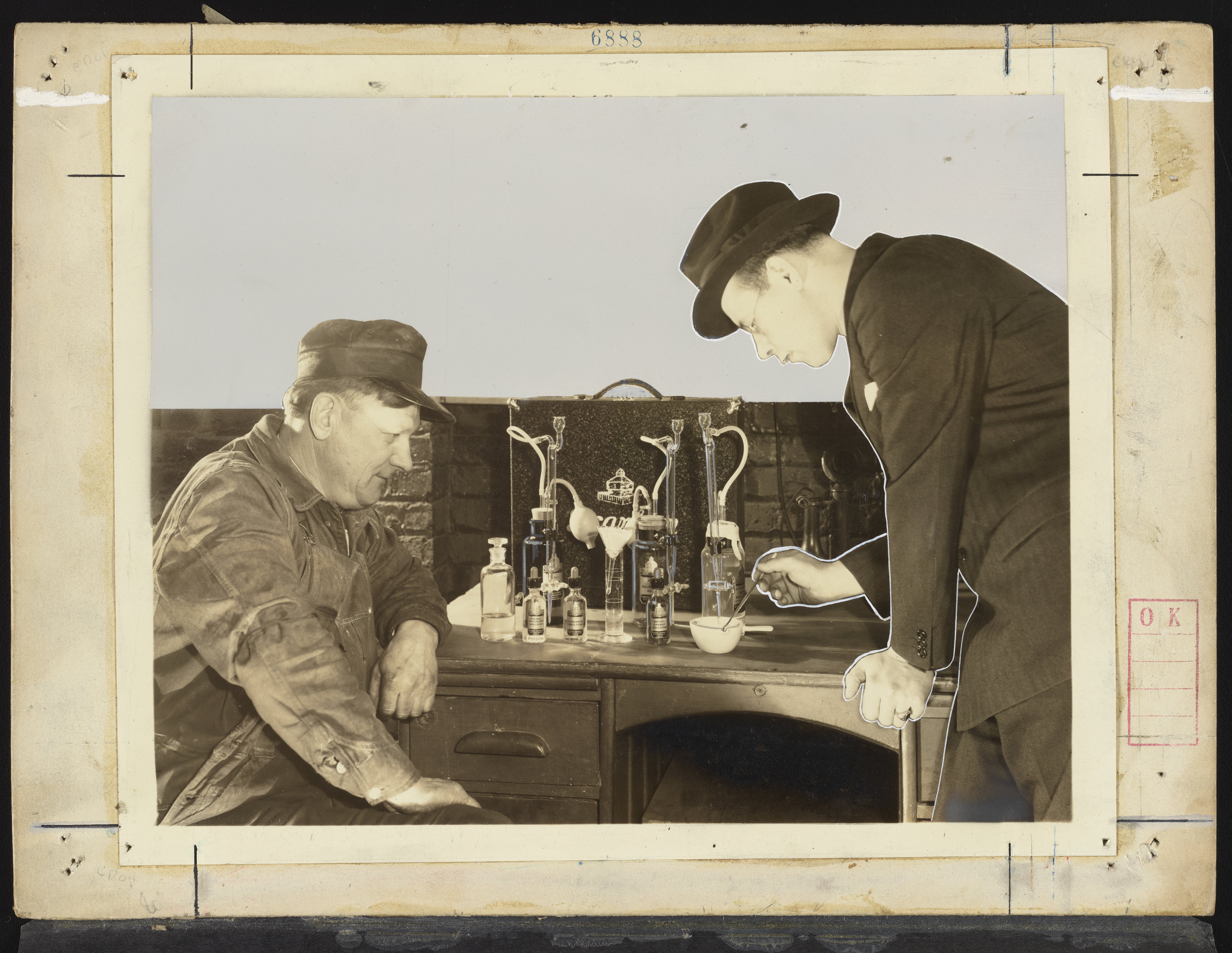 General view of two unidentified men utilizing a Dearborn Chemical Company portable testing cabinet to conduct a water sample field test. Founded in 1887, the Dearborn Chemical Company was a corporate ancestor of BetzDearborn, Incorporated best known for manufacturing water treatment chemicals for use in boilers and cooling towers.