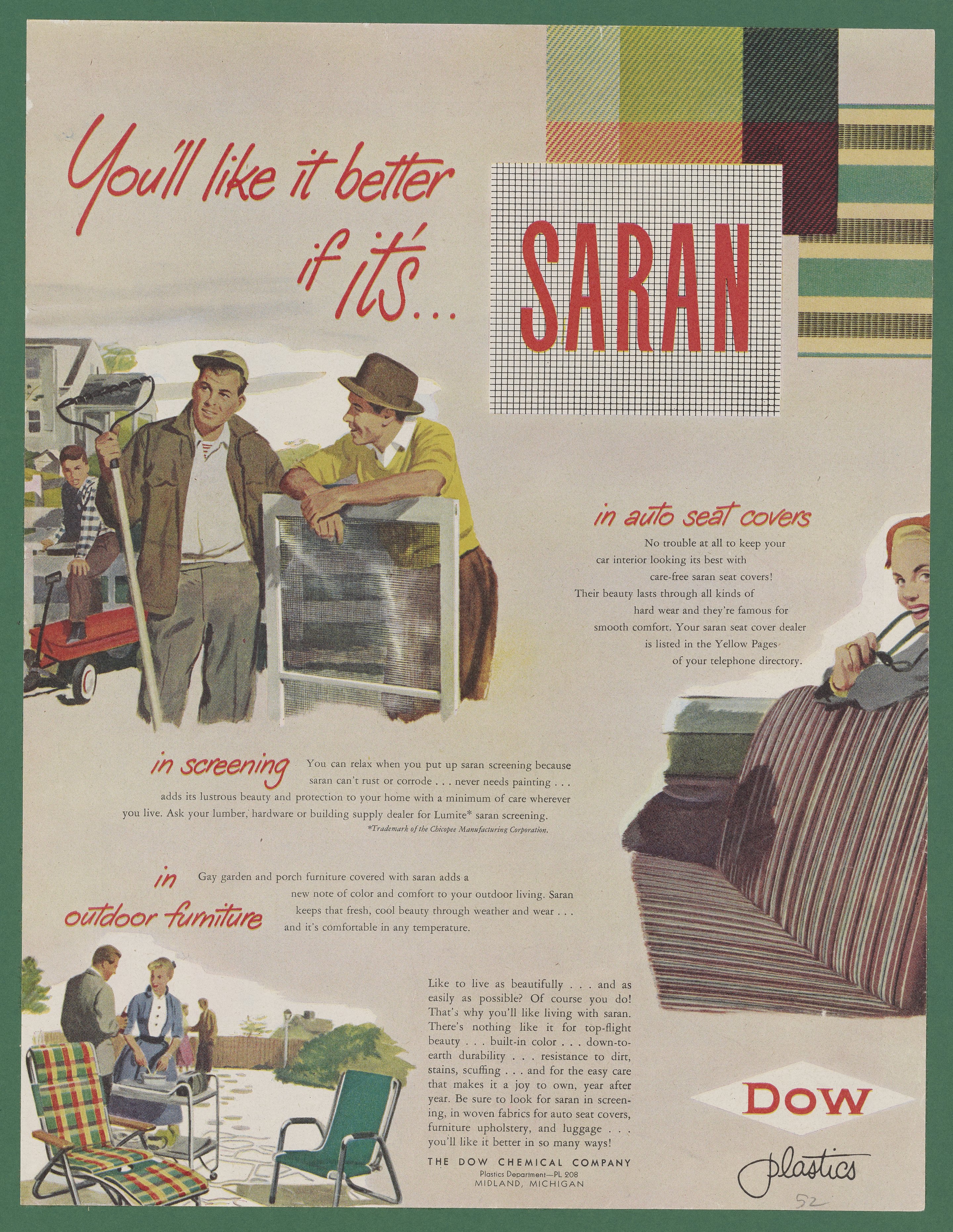 Dow Chemical Company. “You'Ll Like It Better If It'S...SARAN in Auto Seat Covers...,” 1952. Advertisements from the Dow Chemical Historical Collection, Box 5. Science History Institute. Philadelphia. https://digital.sciencehistory.org/works/g4nquqk.