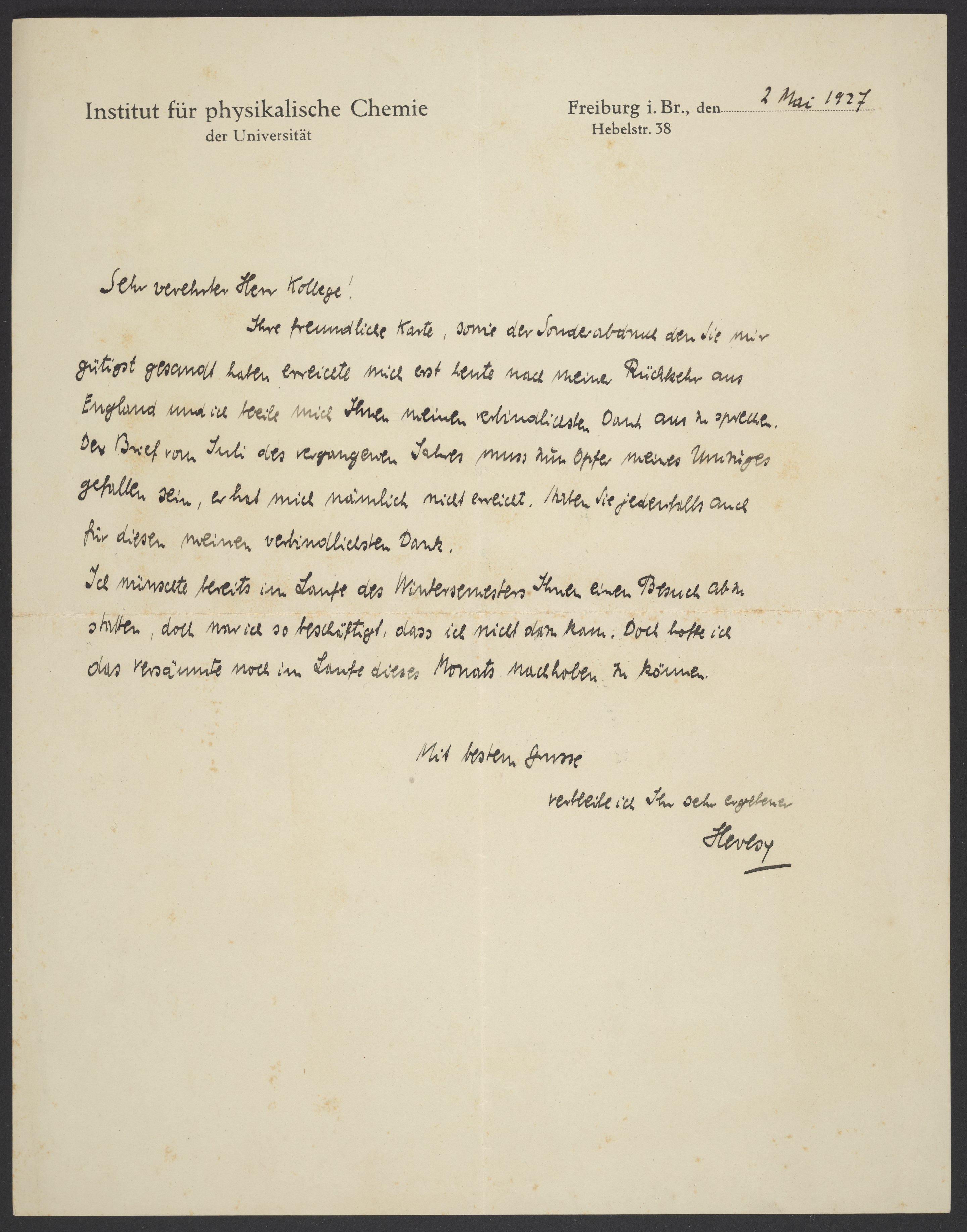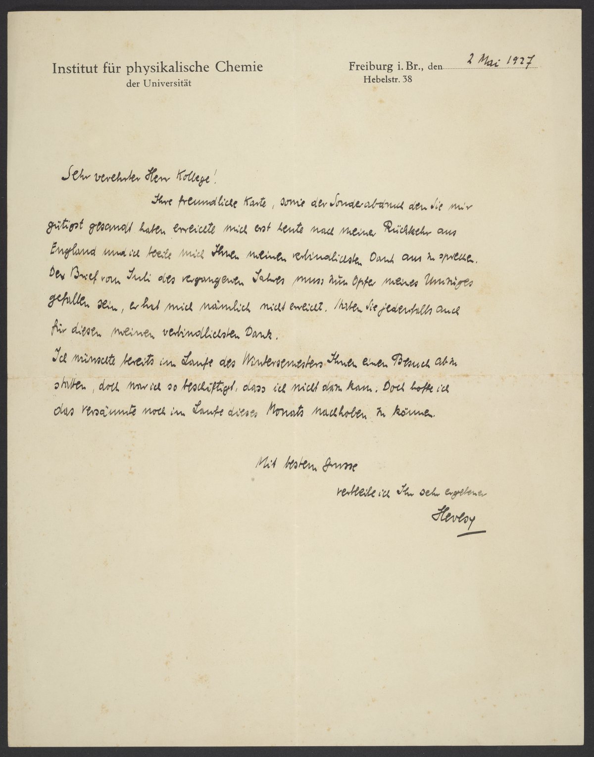 Georg von Hevesy was a Hungarian chemist. He worked in inorganic and nuclear chemistry at Stockholm University. In 1923, he co-discovered the element hafnium. He received the Nobel Prize in Chemistry in 1943 for his contribution to the development of radioactive tracers. At the time this letter was written, Hevesy was a professor of physical chemistry at the University of Freiburg.