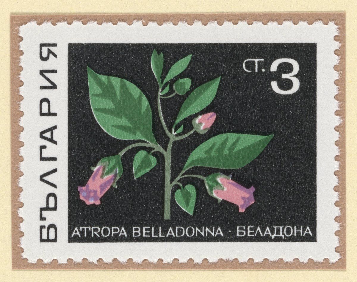 1969 Bulgarian postage stamp featuring an illustration of deadly nightshade (Atropa belladonna). Deadly Nightshade's alkaloids, such as atropine and scopolamine, are used in modern medicine to dilate pupils, treat motion sickness, and reduce muscle spasms.