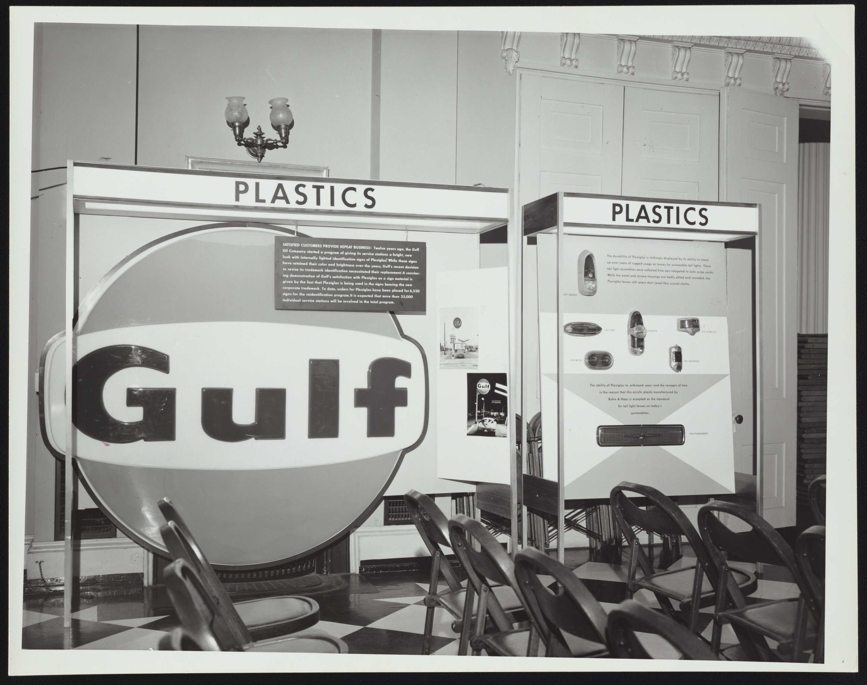 General view of an exhibit panel on plastics, specifically Plexiglas, exhibited at the 1964 Rohm and Haas Company stockholders' meeting. The left-hand side of the panel features a Gulf service station sign molded of Plexiglas, with accompanying text detailing the use of Plexiglas at more than 35,000 individual service stations. The right-hand side of the panel features a variety of automobile tail lights molded of Plexiglas, with accompanying text highlighting the material's clarity and durability.