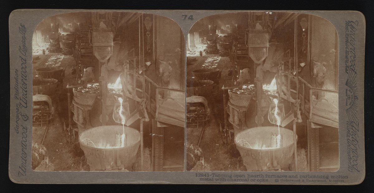 “Tapping Open Hearth Furnaces and Carbonizing Molten Metal with Charcoal or Coke.” Underwood & Underwood, n.d. Underwood & Underwood Stereographs of Manufacturing Industries. Science History Institute. Philadelphia. https://digital.sciencehistory.org/works/g732d8963.