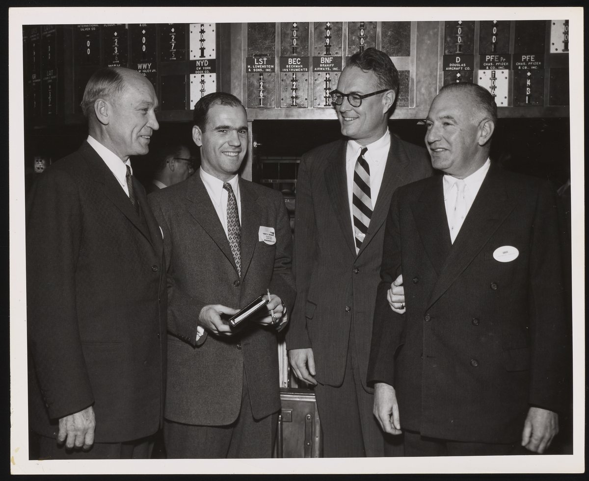 From left to right: Arnold O. Beckman (founder of Beckman Instruments), Michael Bregman, Keith Funston, and Fred Erhman.